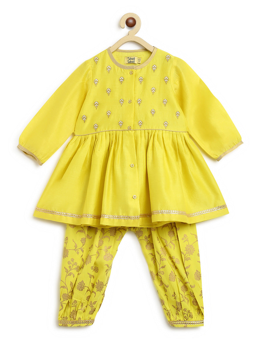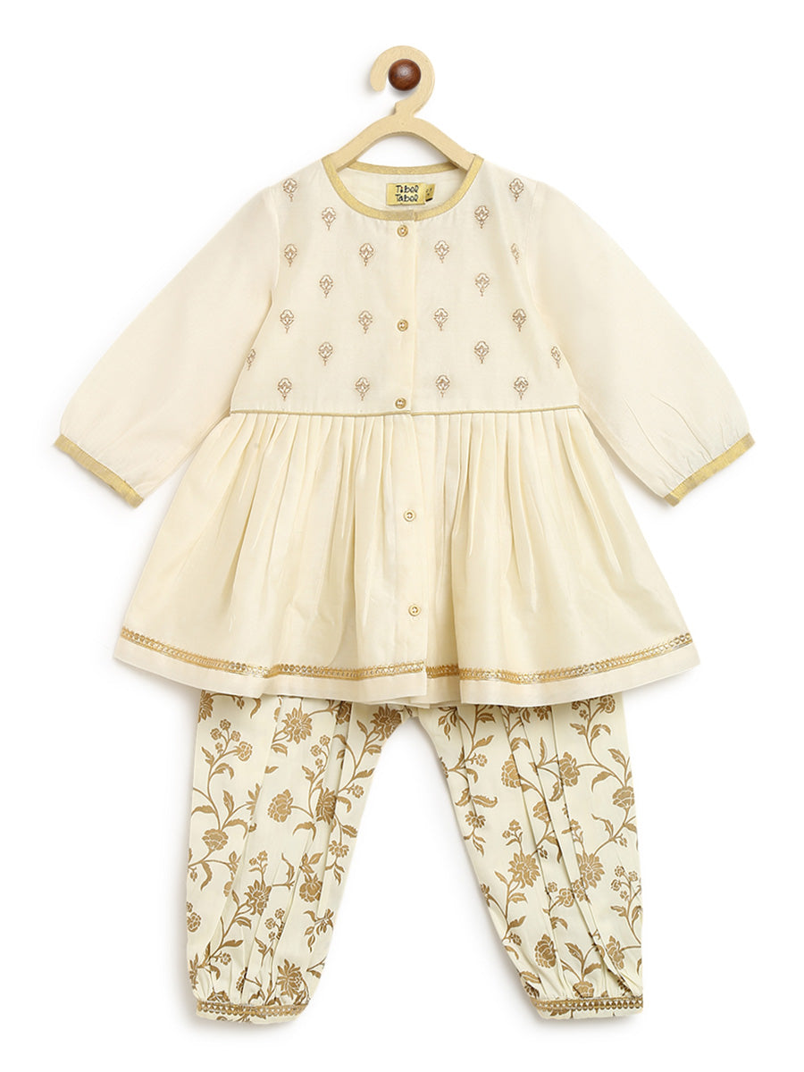 This Angrakha set is made in soft pastel colors in viscose silk Chanderi and embellished with embroidery. Wear it as a co-ords set for a neo-ethnic look or wear it like a dress for a play date, the versatility and comfort of this modern yet traditional look are sure to make it her favourite.