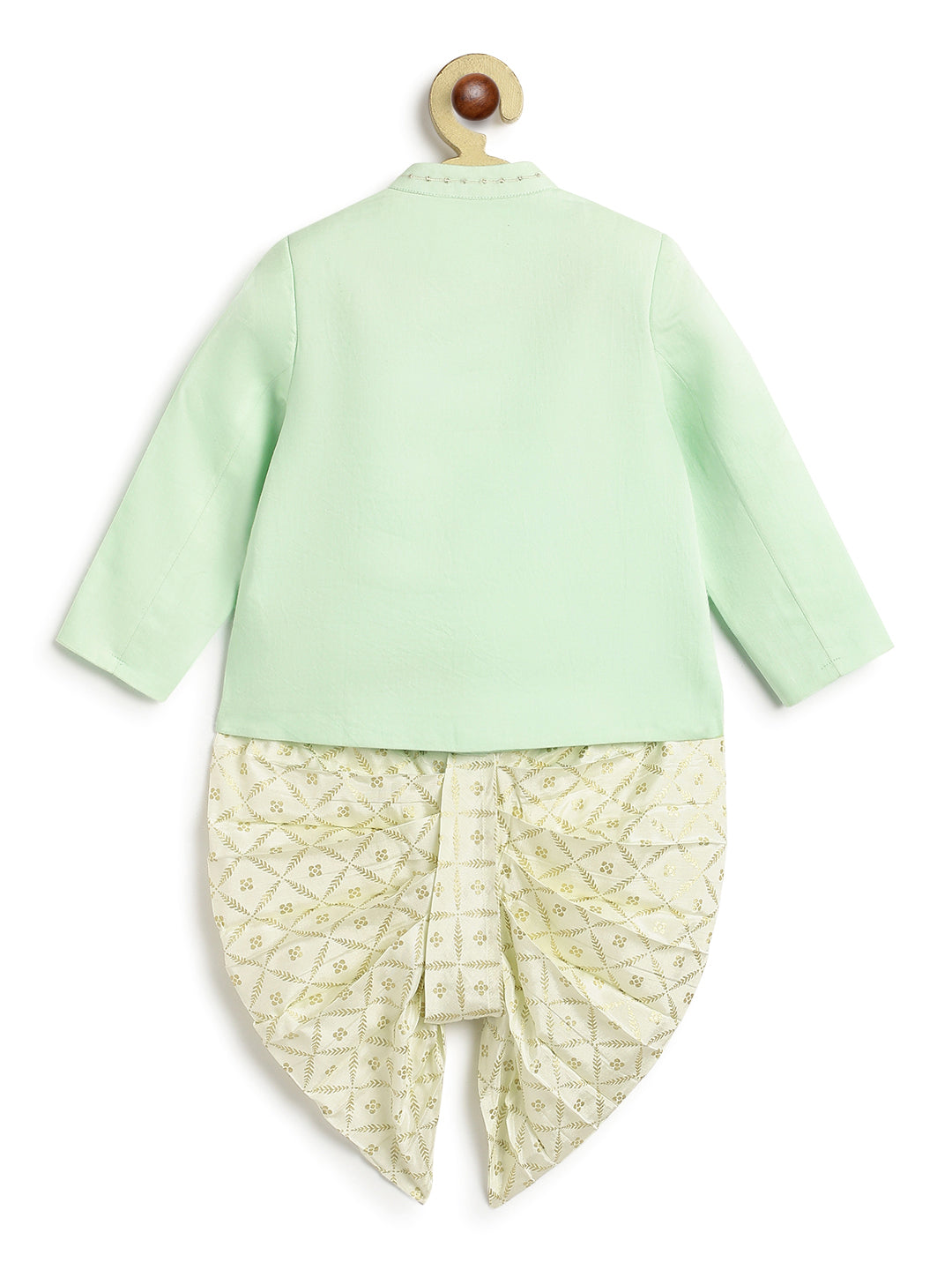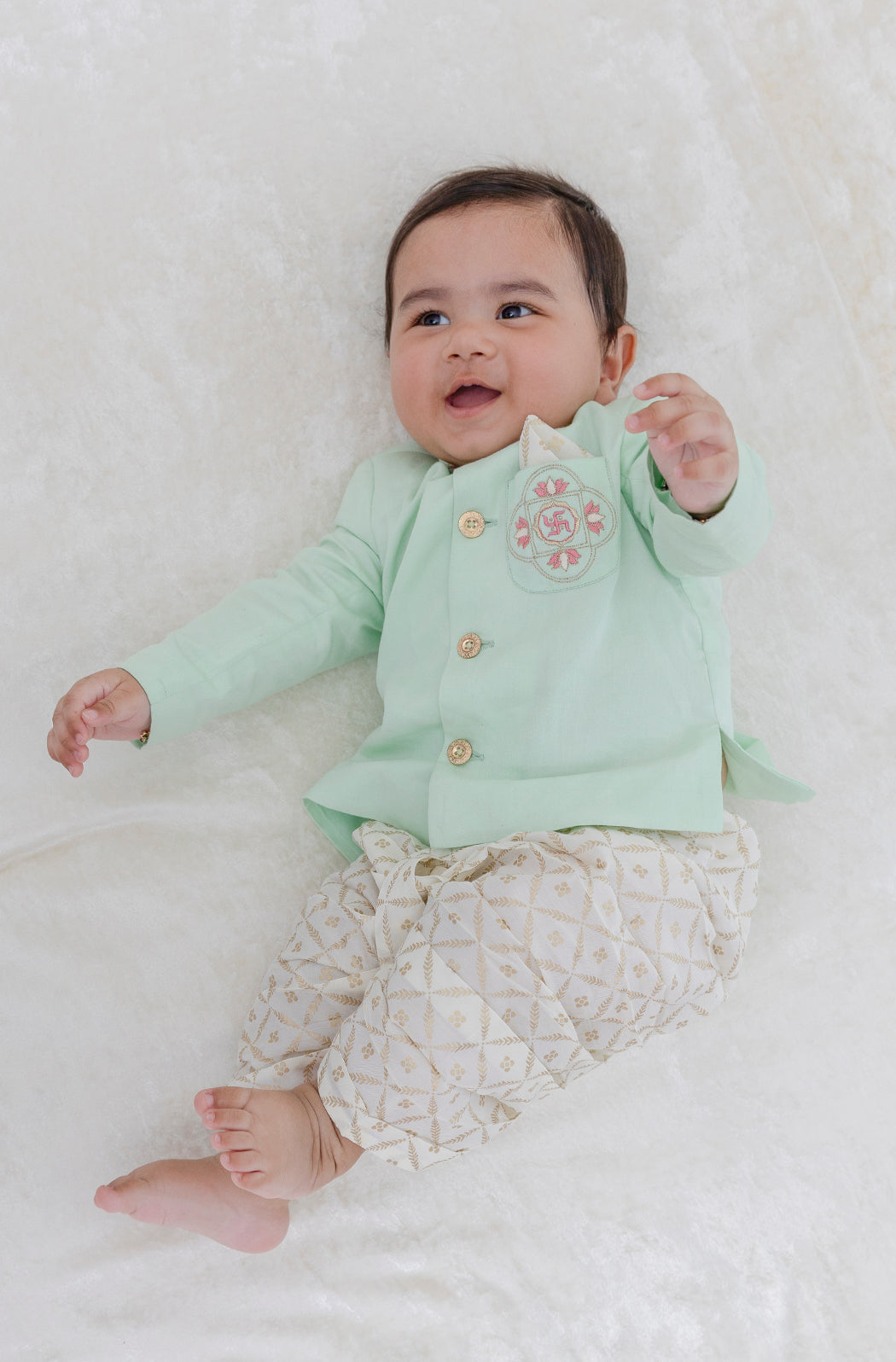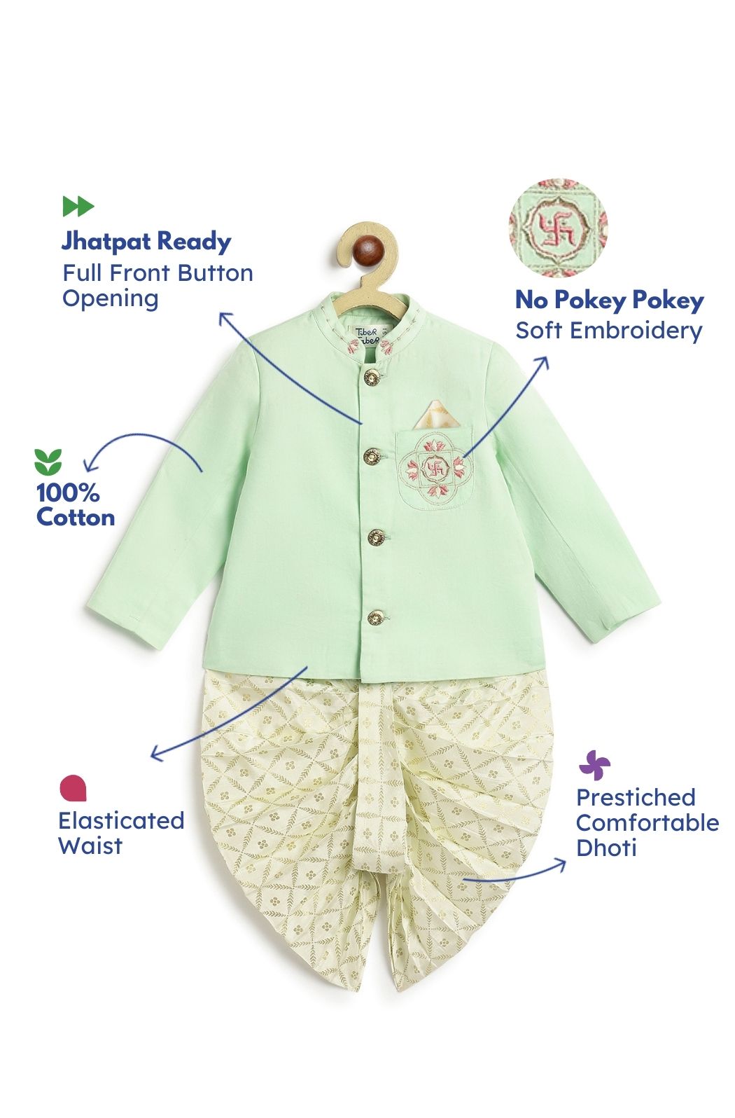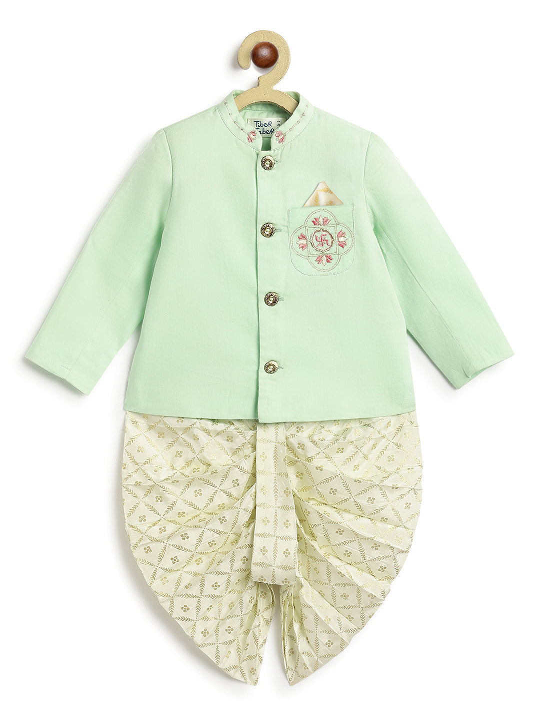 Dress your little prince in this royal attire, designed for first festivities, family gatherings, and picture-perfect moments. The comfy bandhgala is tailored in soft cotton satin and features an embroidered pocket and matching pocket square. Comes with festive foil print dhoti. Comfortable yet occasion-ready, this set blends tradition with ease.