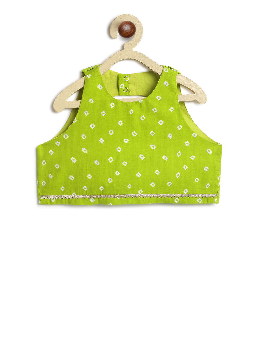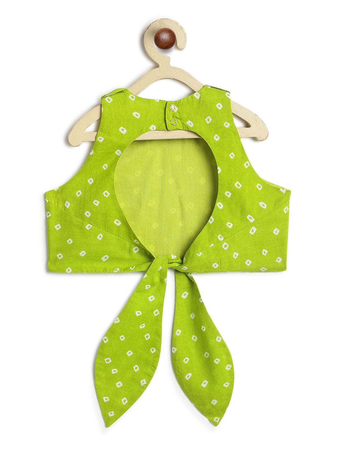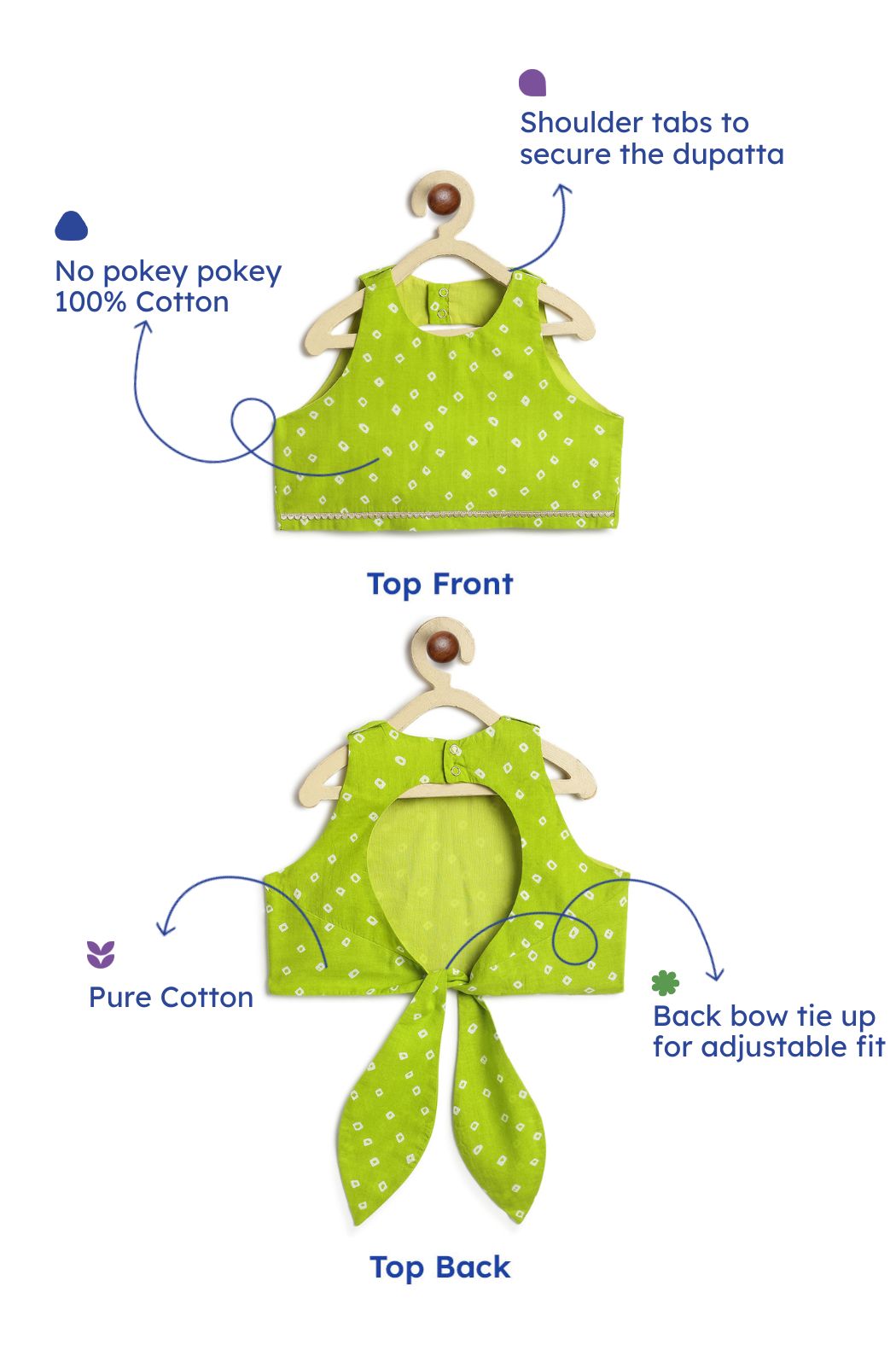 Vibrant colors, playful charm, and endless twirls – this lehenga set has it all! The bright green blouse (with shoulder tabs for the duapatta) pairs beautifully with the rich purple lehenga with bandhani-inspired print. A soft dupatta completes the festive look, making it the perfect outfit for weddings, pujas, and special occasions.