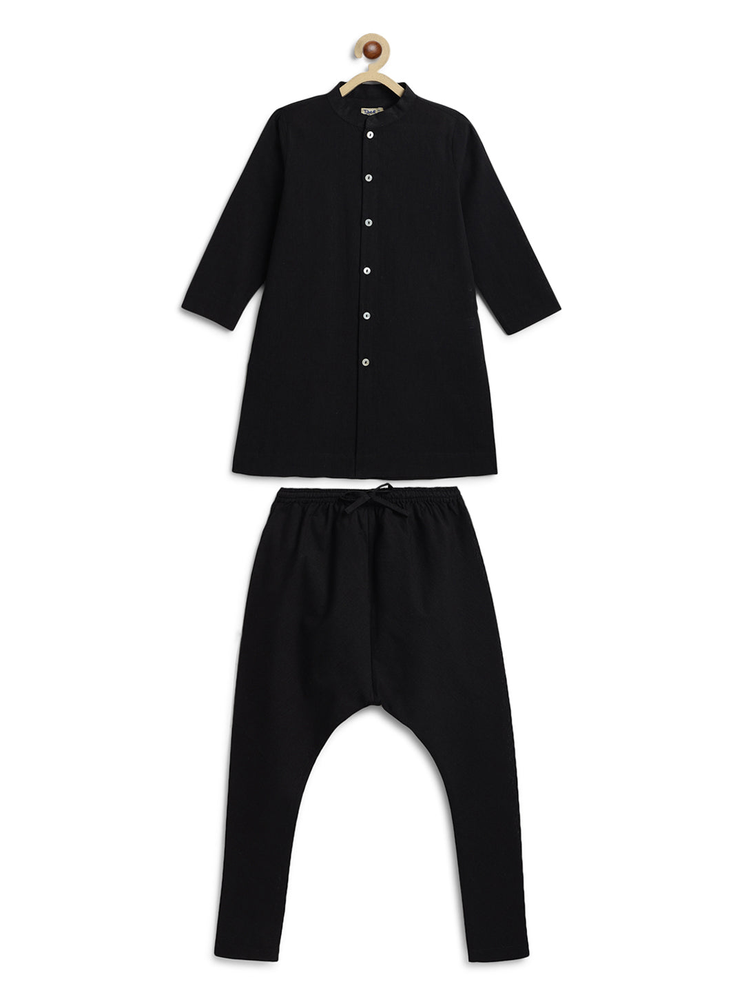 Introduce classic elegance into his closet with this kurta and churidar set.This cotton essential offers the perfect modern, smart fit. Wear it effortlessly for any occasion or layer it with a jacket to elevate the look. A truly quintessential and versatile wardrobe fit.