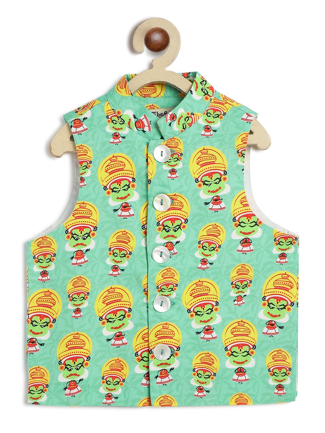 A celebration of culture and color! This ethnic kurta set for boys features an elegant ivory kurta-pyjama teamed with a striking Nehru Jacket printed in vibrant Kathakali inspired motifs — a beautiful tribute to Indian tradition. It’s a festive outfit that’s both playful and graceful, perfect for weddings, festivals, or family functions. Comfortable to wear and rich in detail, your little one is sure to steal the spotlight! Pair with ethnic mojaris or kolhapuris for a complete look!