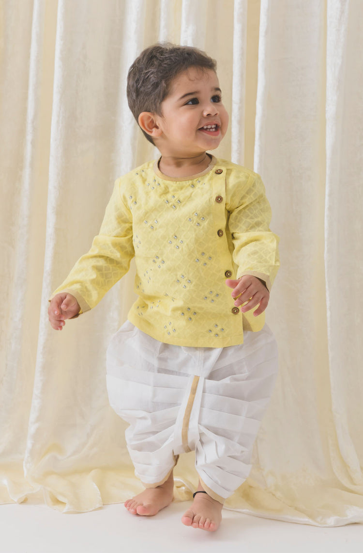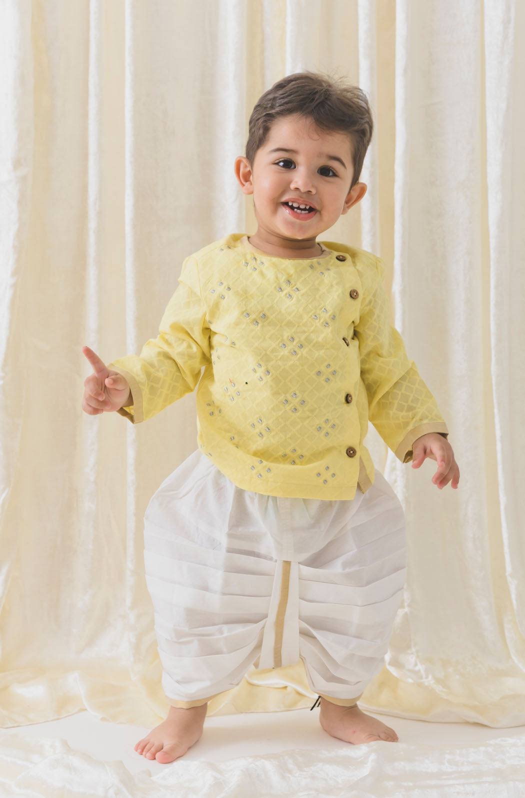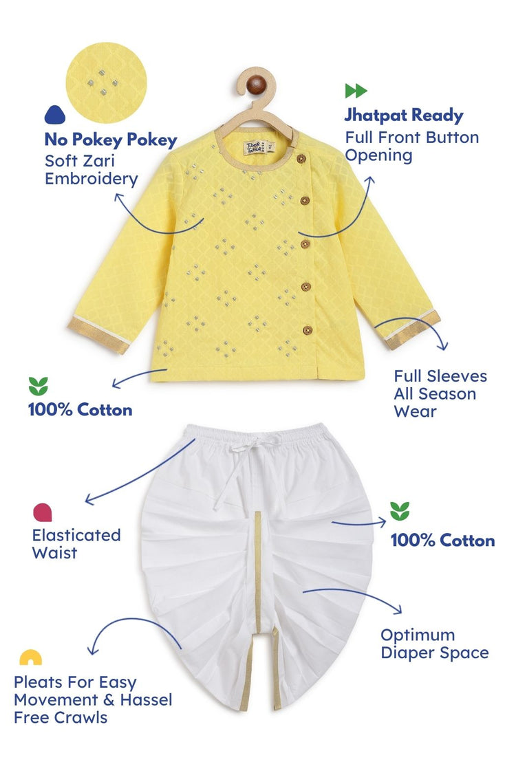 Your new favourite traditional outfit for any celebration that can never go out of style! The Dhoti Kurta set is crafted in luxurious soft cotton with non-pokey zari embroidery. Especially constructed for infants to guarantee long hours of comfort!