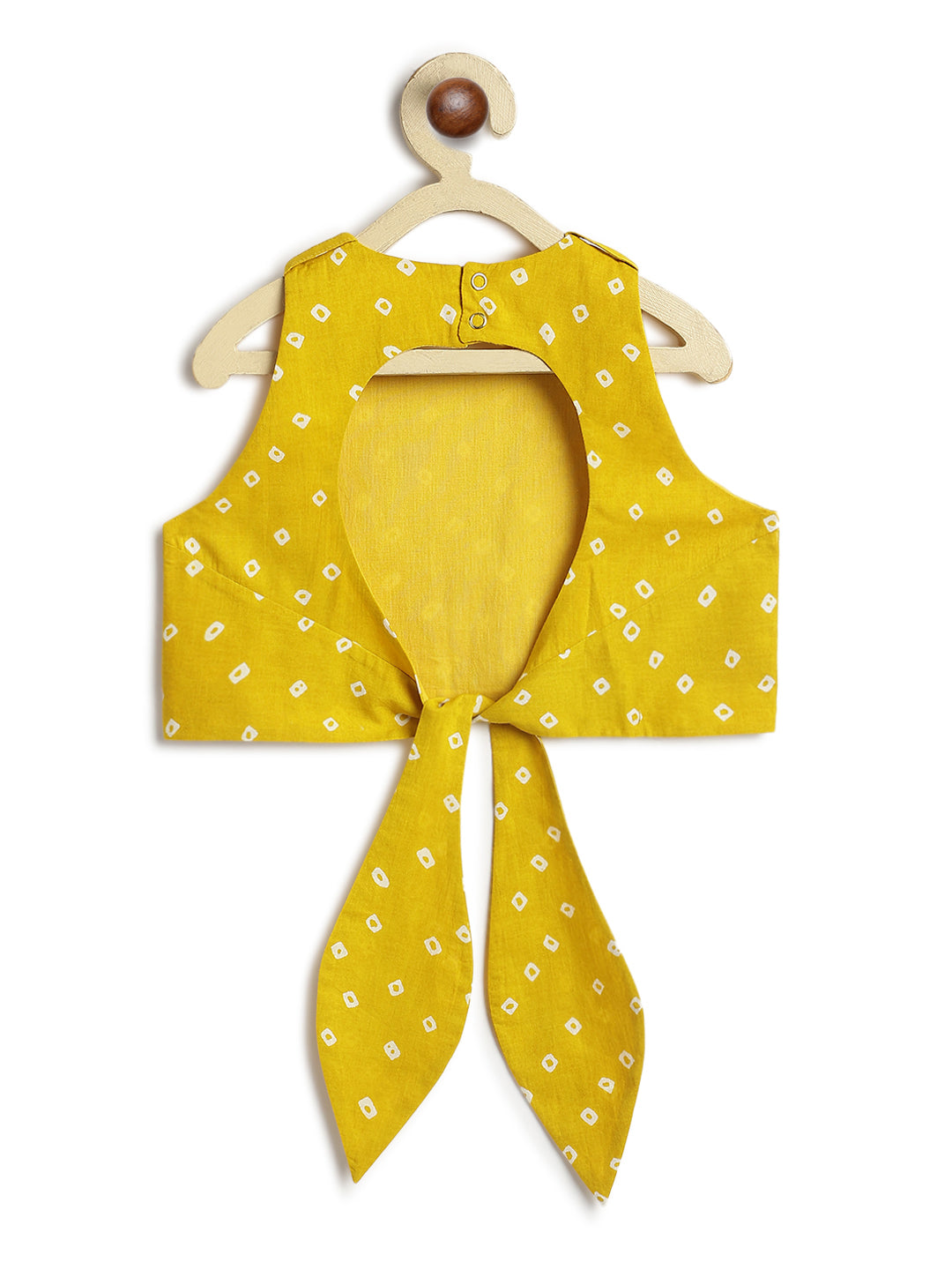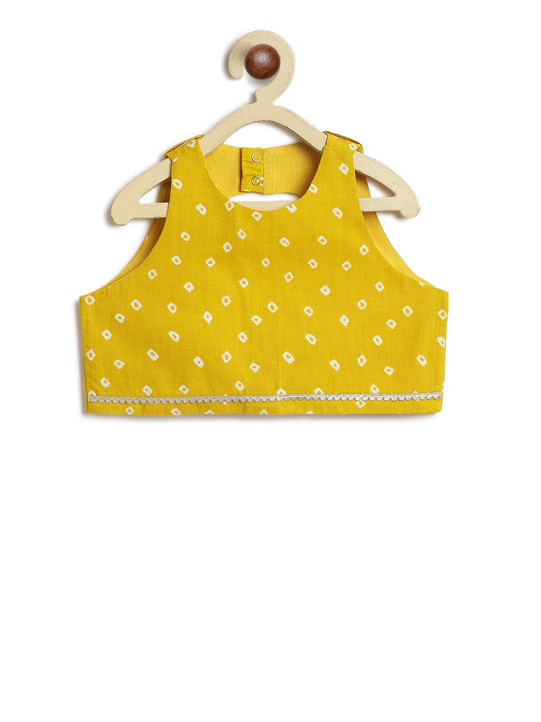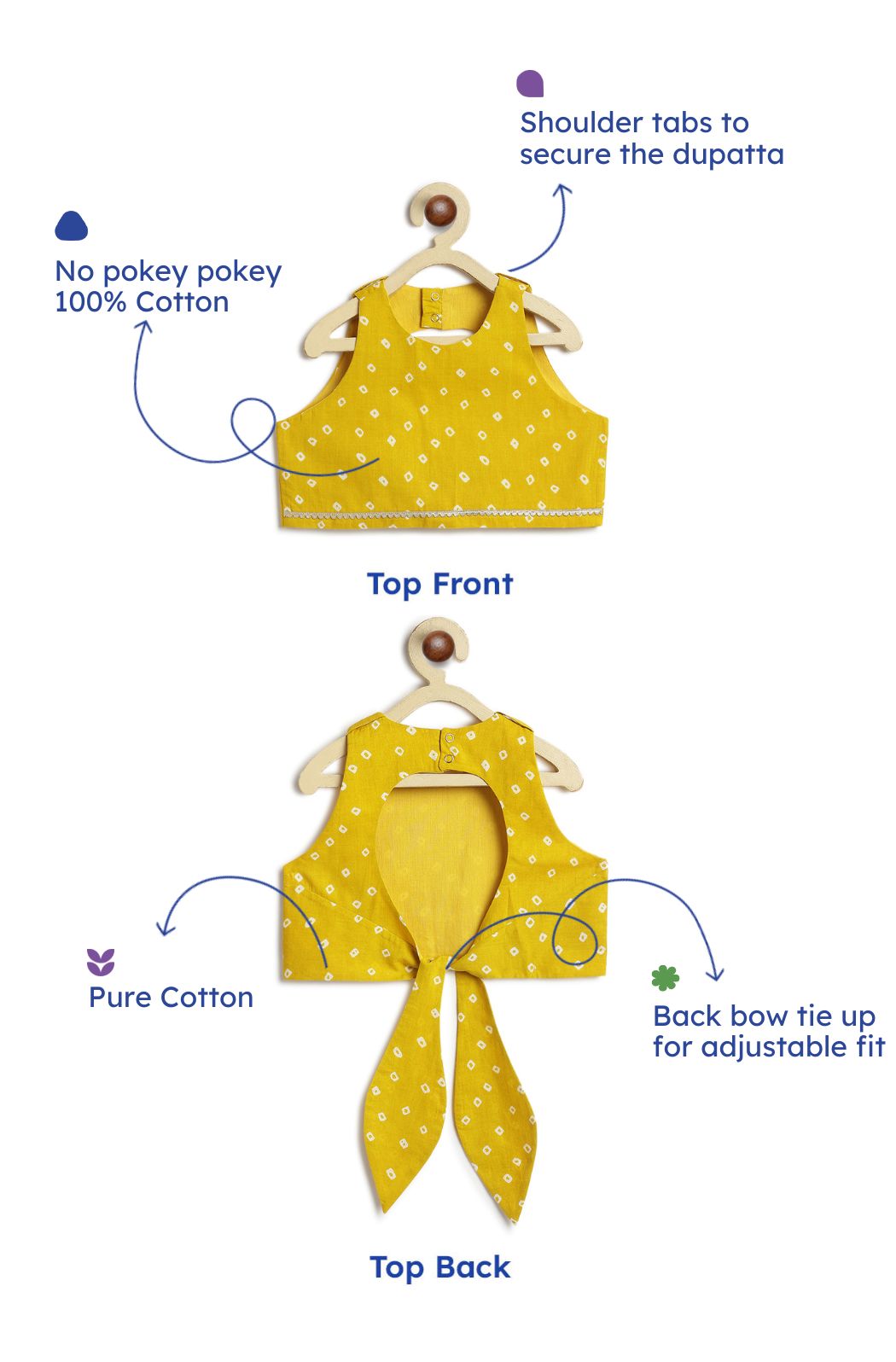 Bright, festive, and full of charm – this lehenga is made for twirls and celebrations! The vibrant mustard blouse (with shoulder tabs for dupatta) paired with a striking red lehenga creates a classic festive look. The delicate bandhani-inspired print and dainty lace finishing make it an ideal pick for weddings, pujas, and joyful family gatherings.