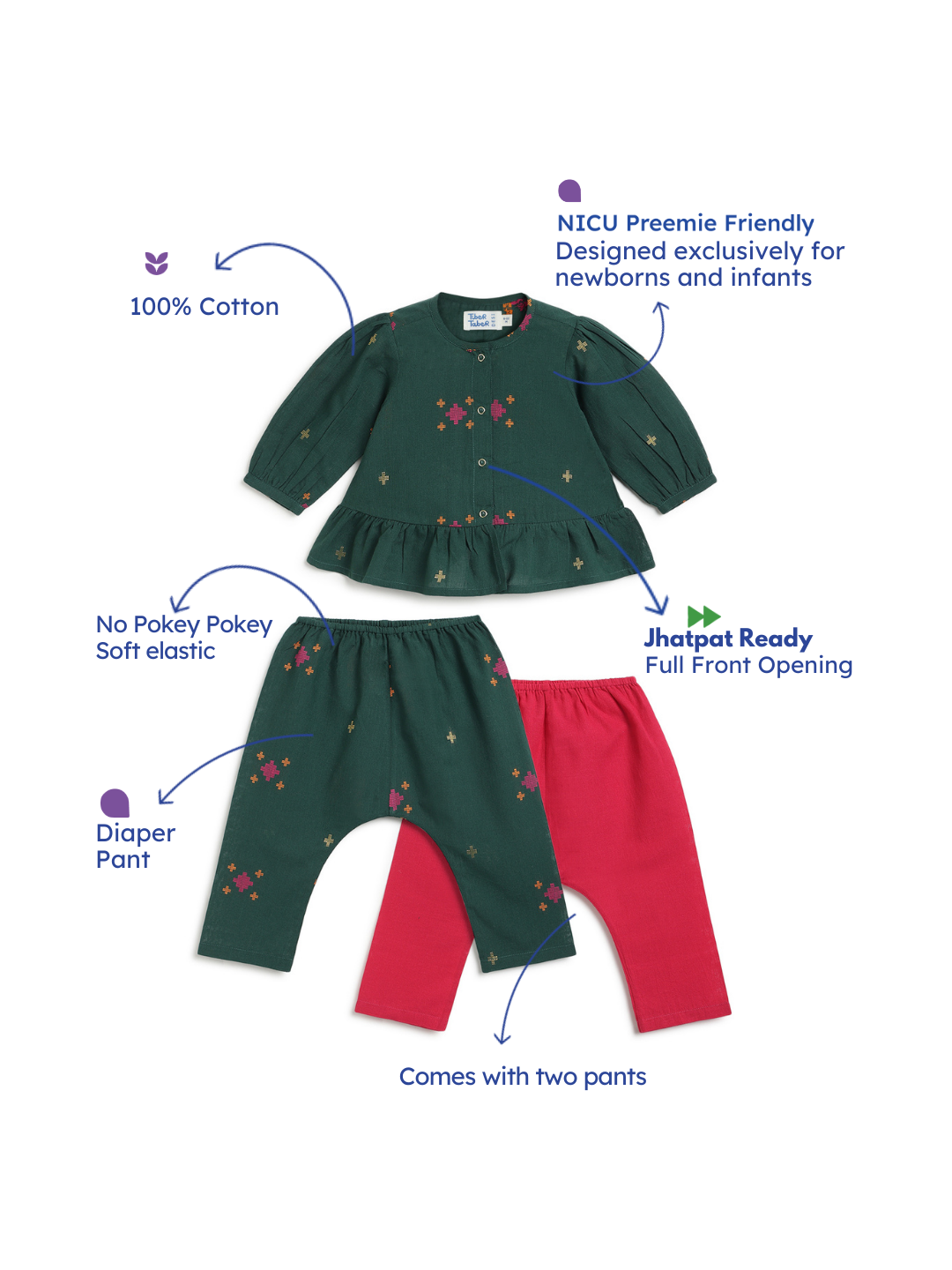A refreshing blend of comfort and character, this thoughtfully designed top set is crafted from soft, breathable cotton. The deep green peplum top features delicate woven motifs, gentle gathers, and softly puffed sleeves for a playful silhouette. Paired with easy-fit contrasting pants, it offers effortless movement, everyday elegance, and all day comfort for outings, celebrations, and cheerful moments.