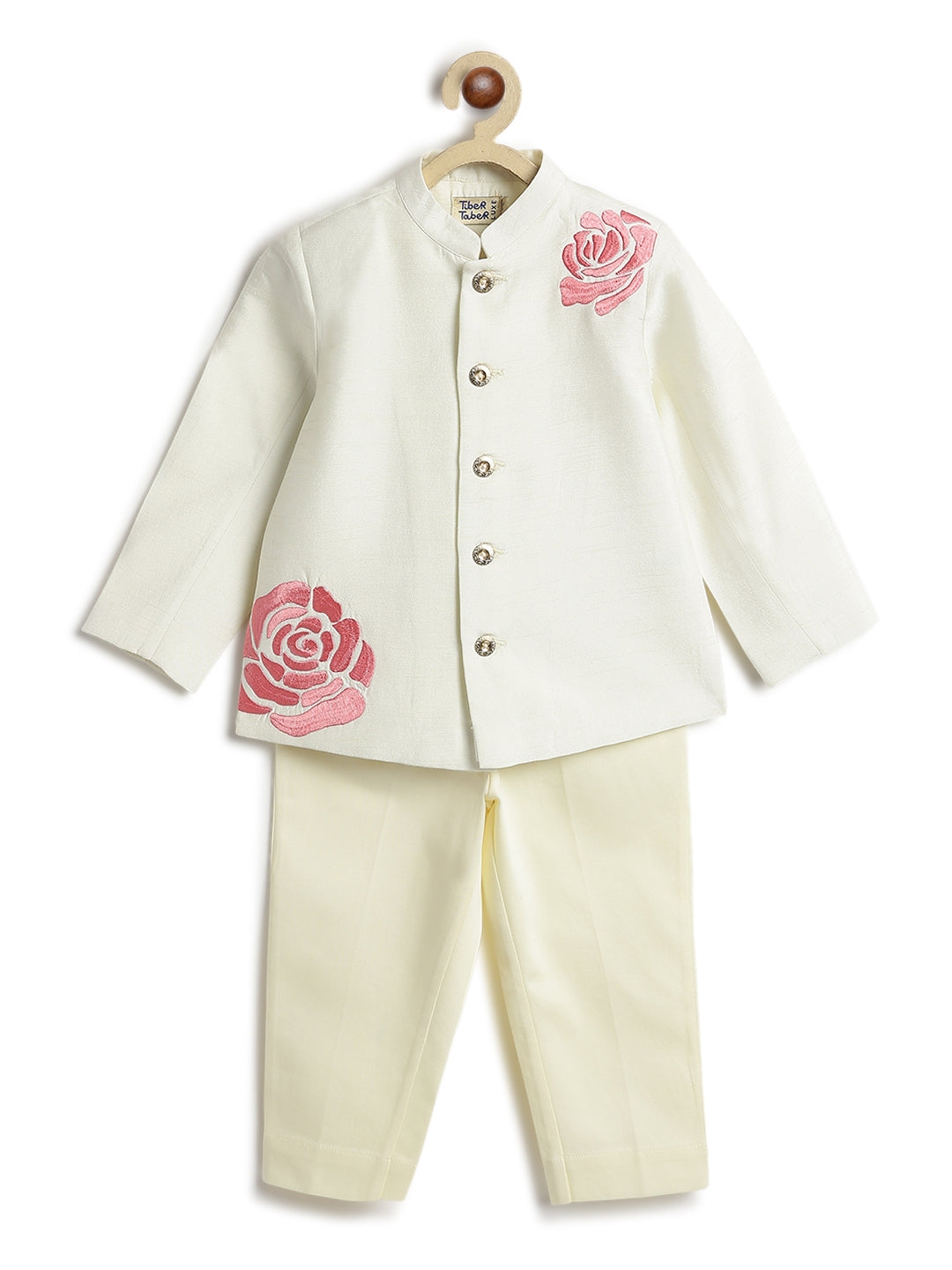 • Design Detail: Cream viscose bandhgala with pink rose embroidery, paired with classic cotton pants