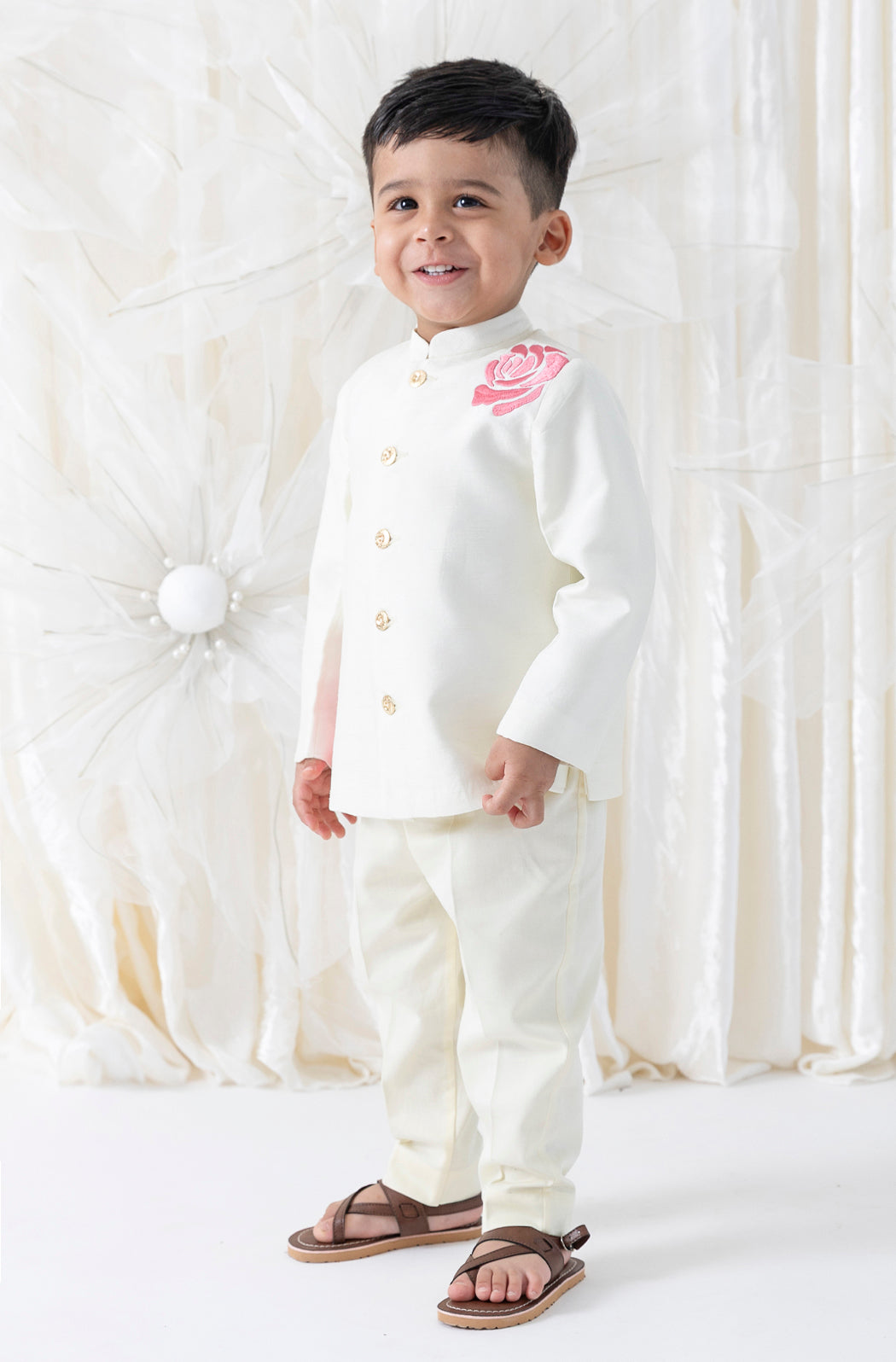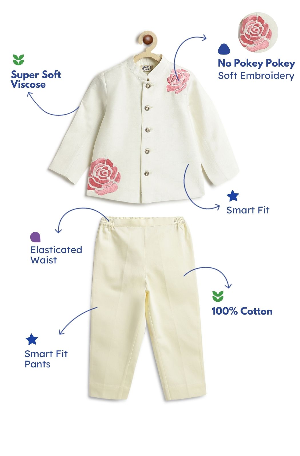 Transform your little boy into a dapper gentleman with this elegant set. Designed with delicate pink rose embroidery on a soft viscose base, the bandhgala is the perfect formal outfit for big days. Paired with relaxed cotton pants, this set is both luxurious and comfortable and works well for weddings, ceremonies, and family gatherings. Thoughtfully tailored for babies and little boys for unrestricted movement.