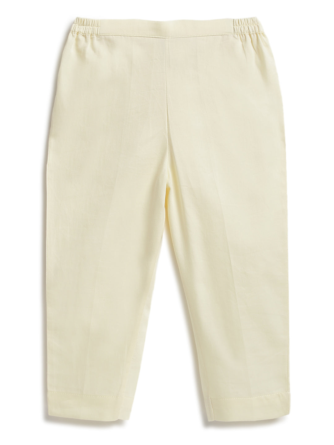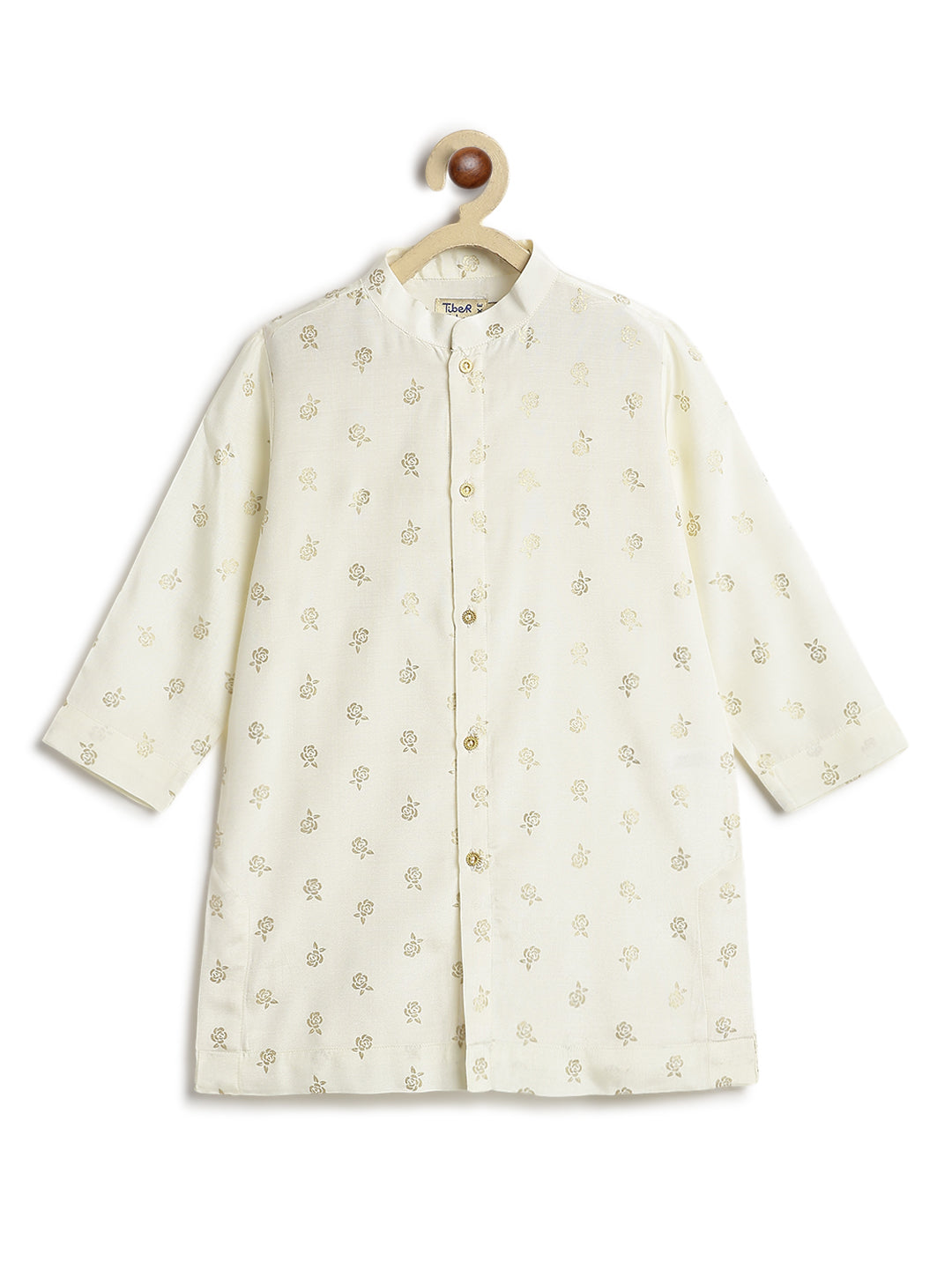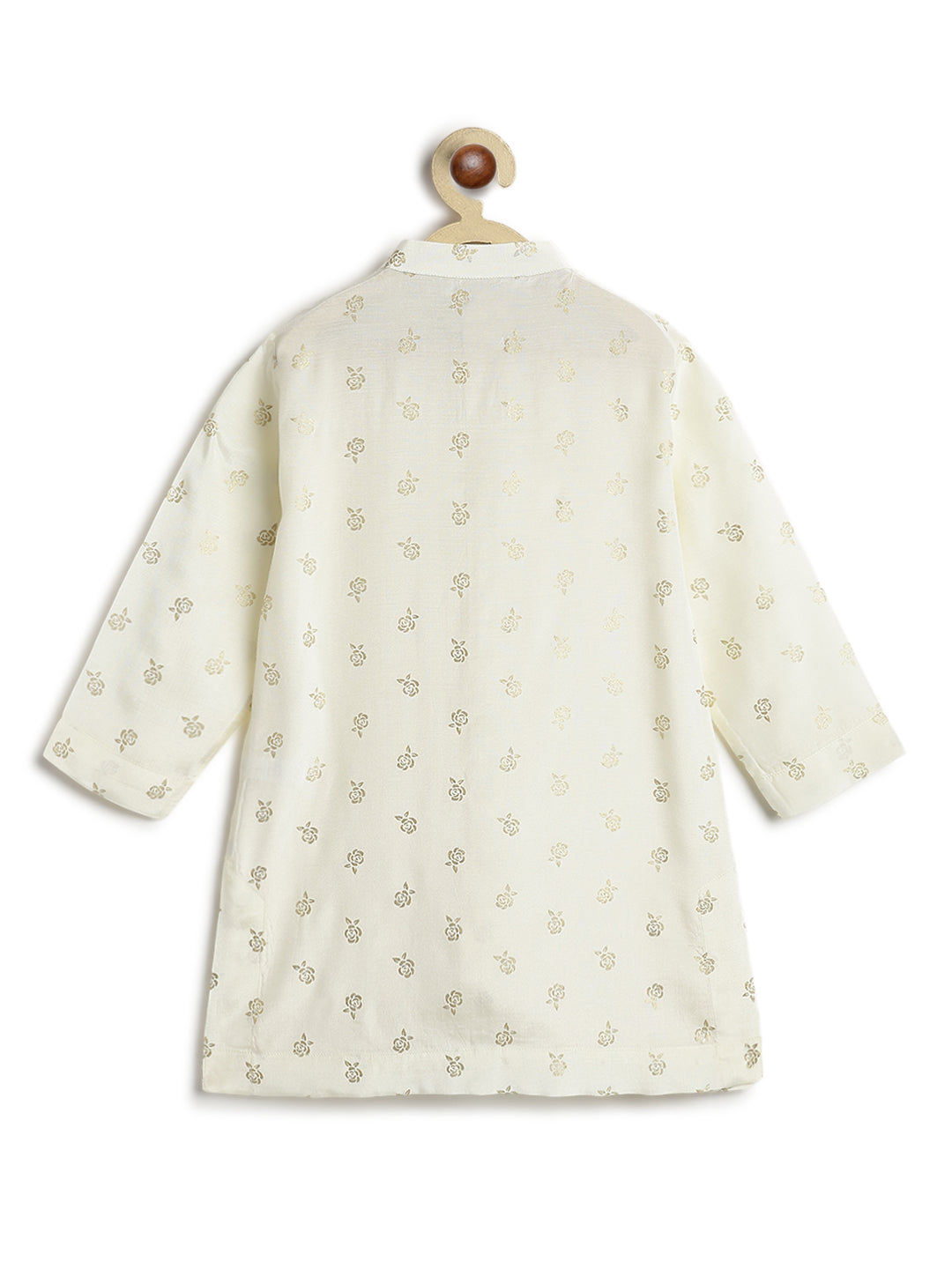 For the little gentleman who loves color, this floral Bundi set is all about effortless style. The soft viscose cream kurta features rose motifs foil print beautifully from under a cream floral Bundi tailored to perfection. Comes with a matching pocket square. Ideal for weddings, festivals, and family events.