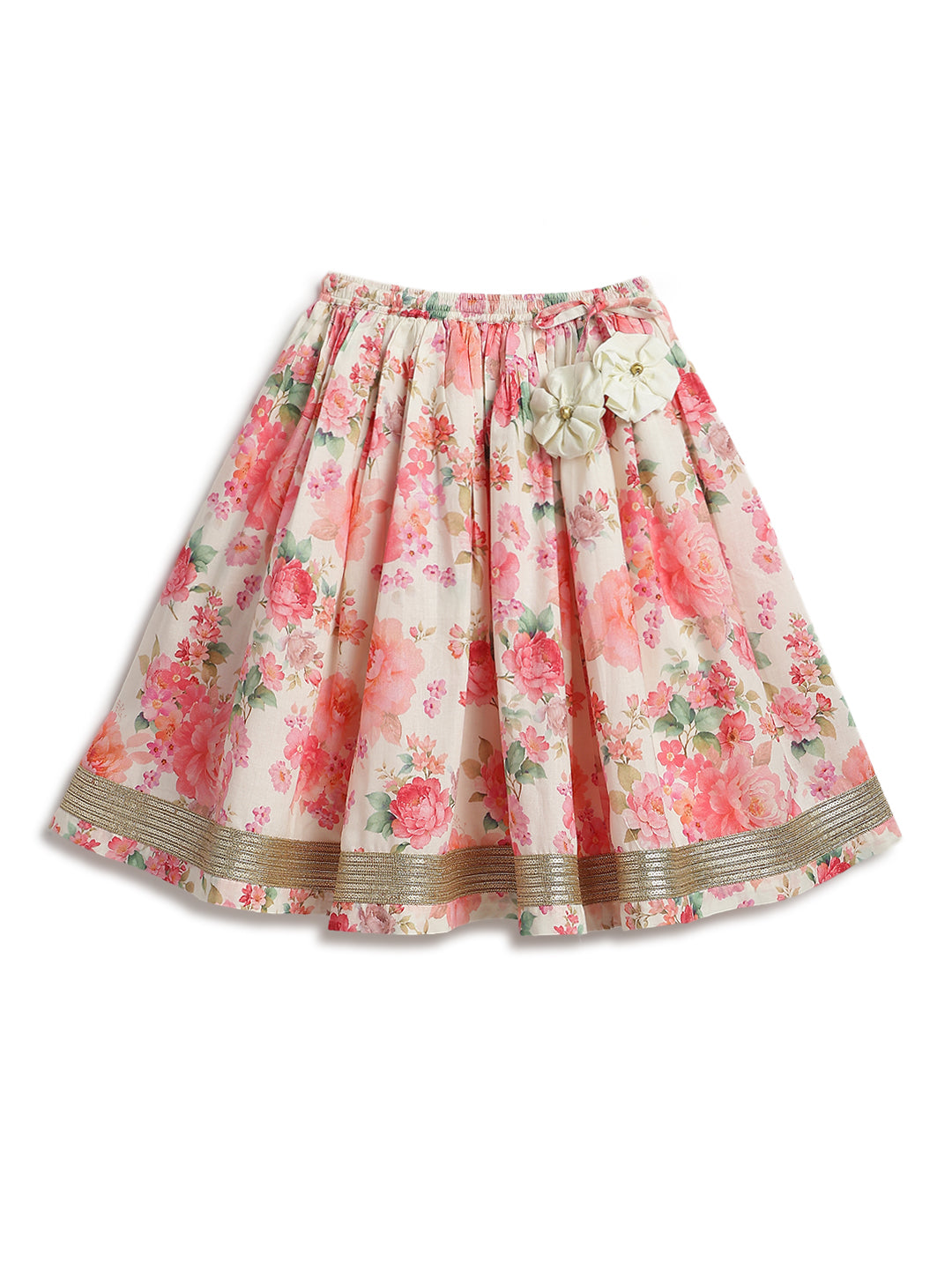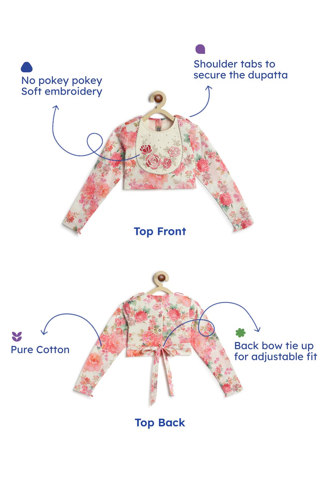 A lehenga fit for your little festive star! This three-piece set features an embroidered blouse with dainty details, a soft cotton lehenga printed with blooming florals, and a breezy dupatta to twirl in. Finished with lace and tassels, it’s perfect for weddings, poojas, and all things celebratory.