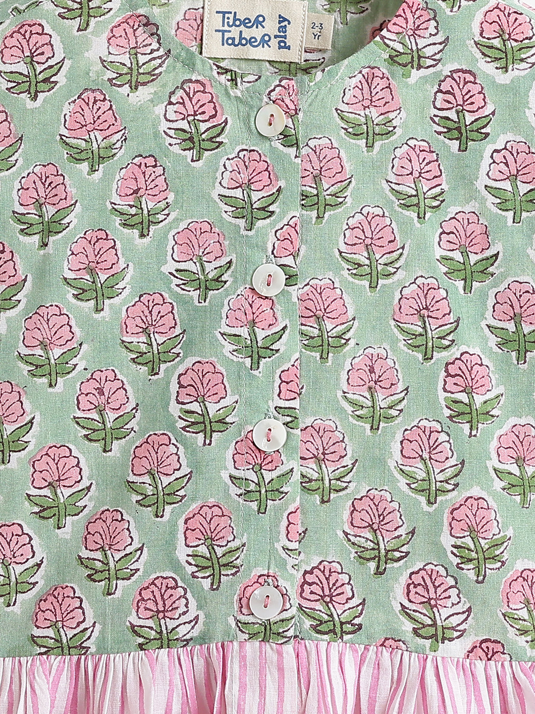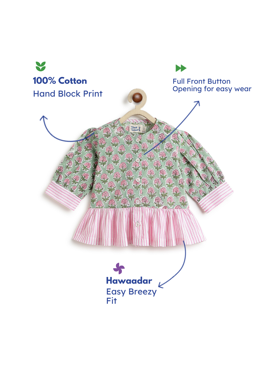 Fresh as a blooming garden, this floral printed top brings effortless charm to your little one’s wardrobe. Adorned with delicate block print motifs and striped detailing, it creates a beautiful contrast. Designed with a comfortable fit, button-down front, and flared silhouette, it ensures easy wear, breathability, and playful movement, perfect for everyday elegance and casual outings.