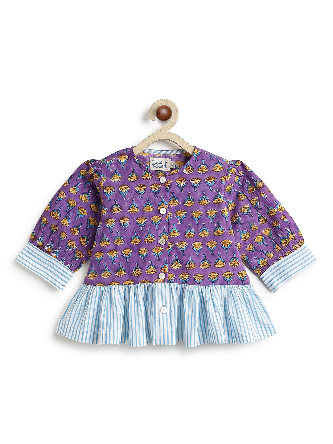 Fresh as a blooming garden, this floral printed top brings effortless charm to your little one’s wardrobe. Adorned with delicate block print motifs and striped detailing, it creates a beautiful contrast. Designed with a comfortable fit, button-down front, and flared silhouette, it ensures easy wear, breathability, and playful movement, perfect for everyday elegance and casual outings.