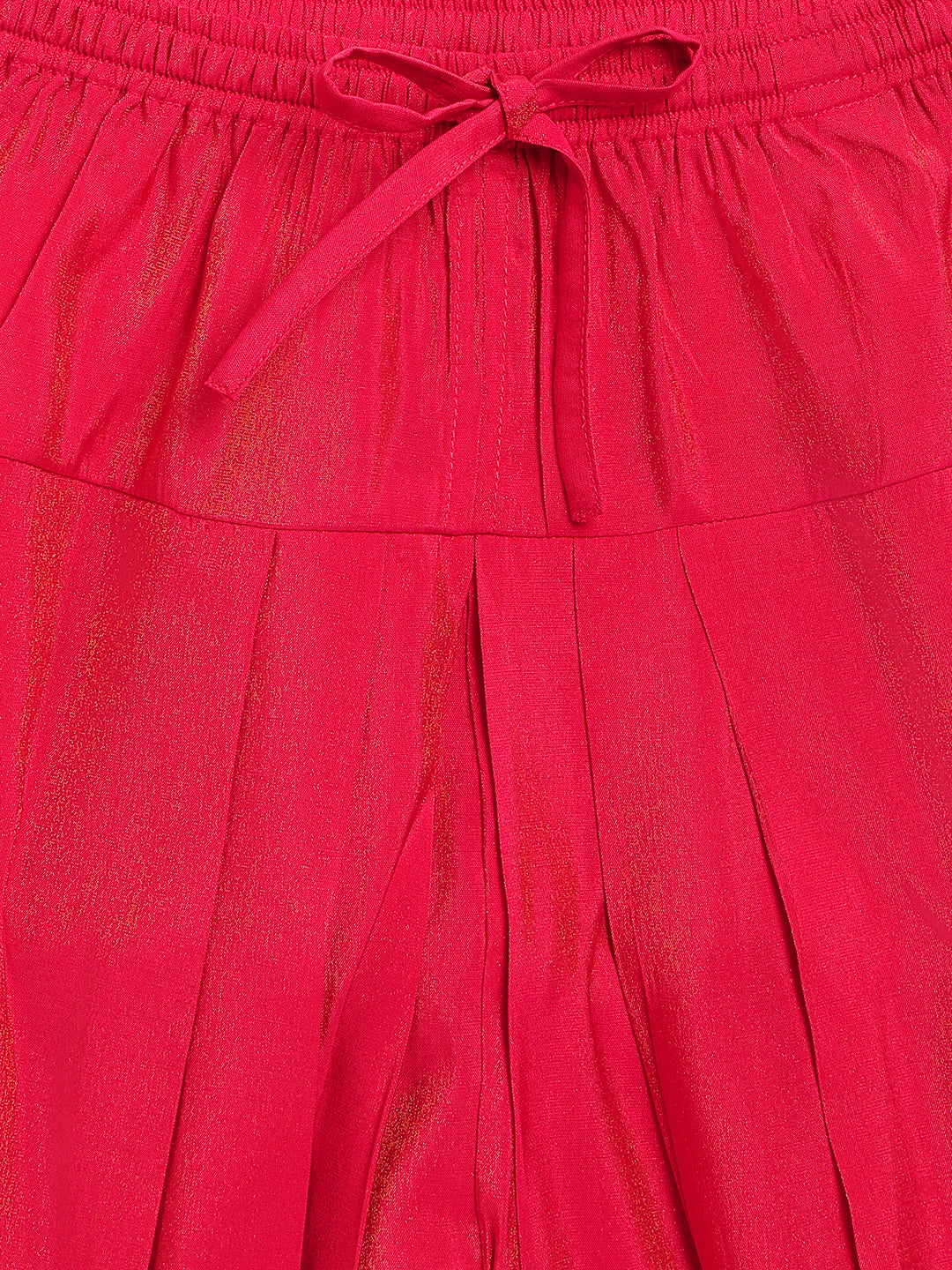 A rich ruby straight-cut kurta featuring a brocade front panel, lace trims and dainty tie-ups on the sides. Paired with a comfy salwar detailed at the hem, it’s fuss-free yet festive. Ideal for weddings, poojas and every celebration that calls for cute royalty!