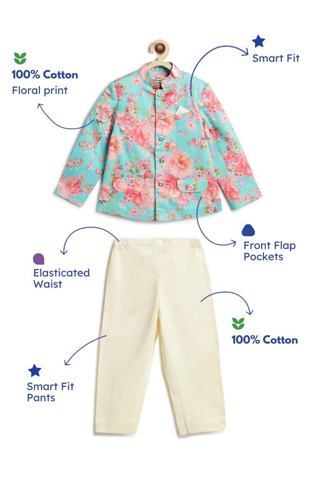 A fresh take on festive dressing, this cotton bandhgala set comes with happy florals that scream “celebration”. Lightweight and breathable, it’s perfect for daytime celebrations, pujas, or family get-togethers. An outfit that blends traditional charm with everyday comfort. Thoughtful details include soft collar, side slits and relaxed fit.