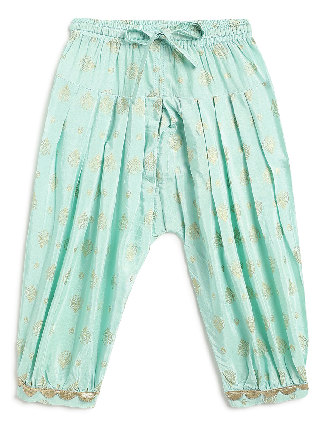 Now here’s the perfect outfit for your ‘ghar ki laxmi’. The bright pink pleated kurta features Laxmi feet motif, perfect to mark auspicious beginnings. Paired with a vibrant blue salwar with golden foil print and a soft chiffon dupatta, the outfit is traditional yet playful. The Kurta comes with a shoulder loop to keep the dupatta in place.