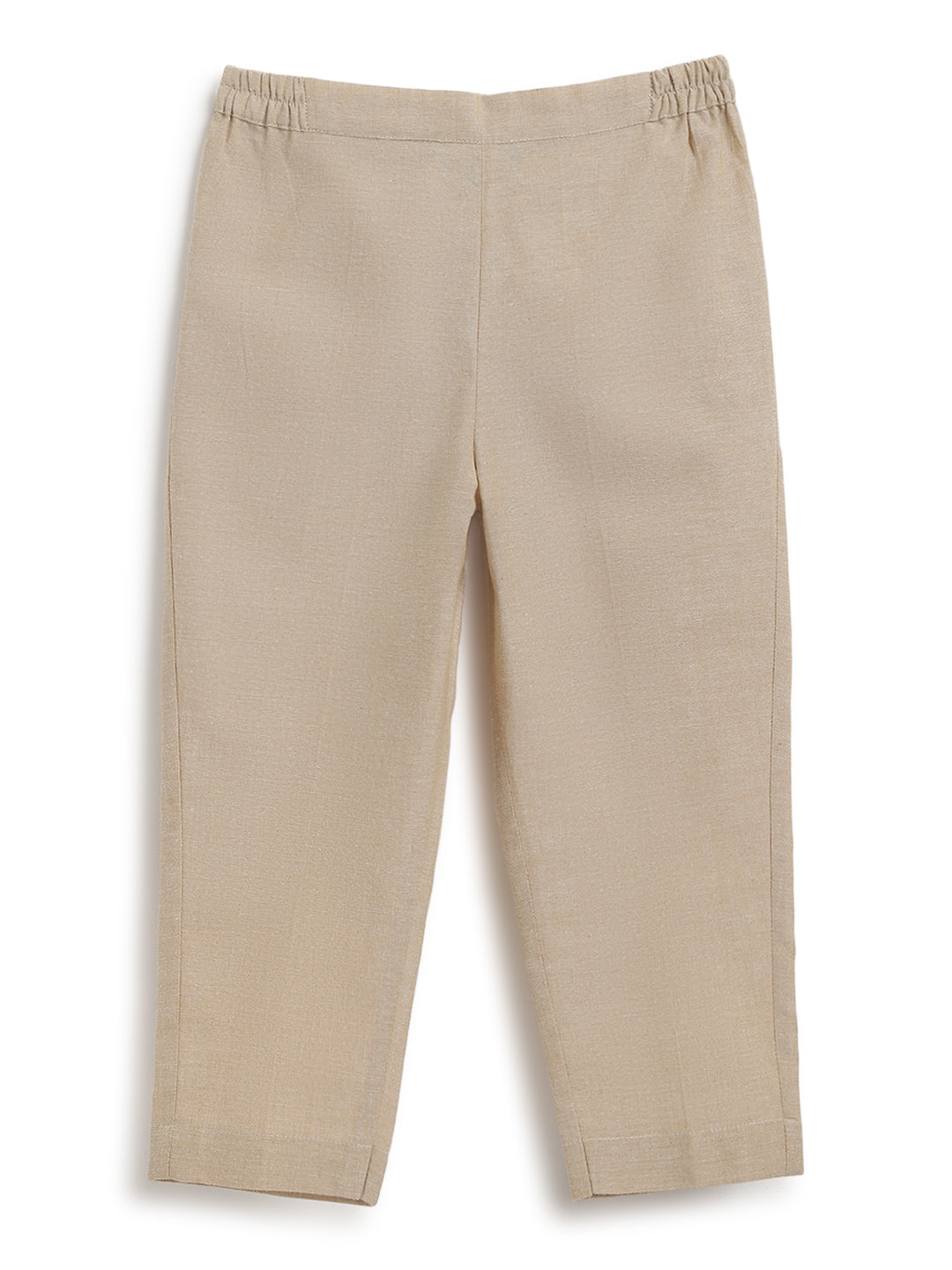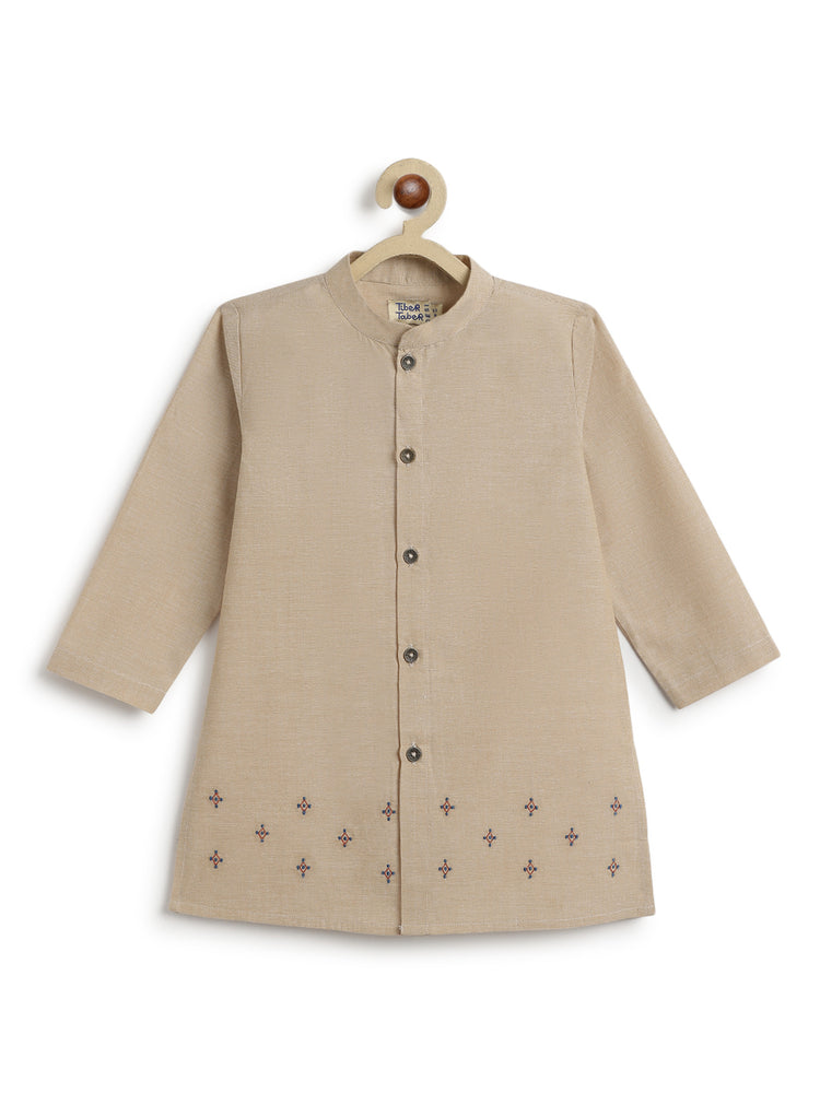 • Kurta: Beige cotton, full front button opening, subtle thread embroidery.