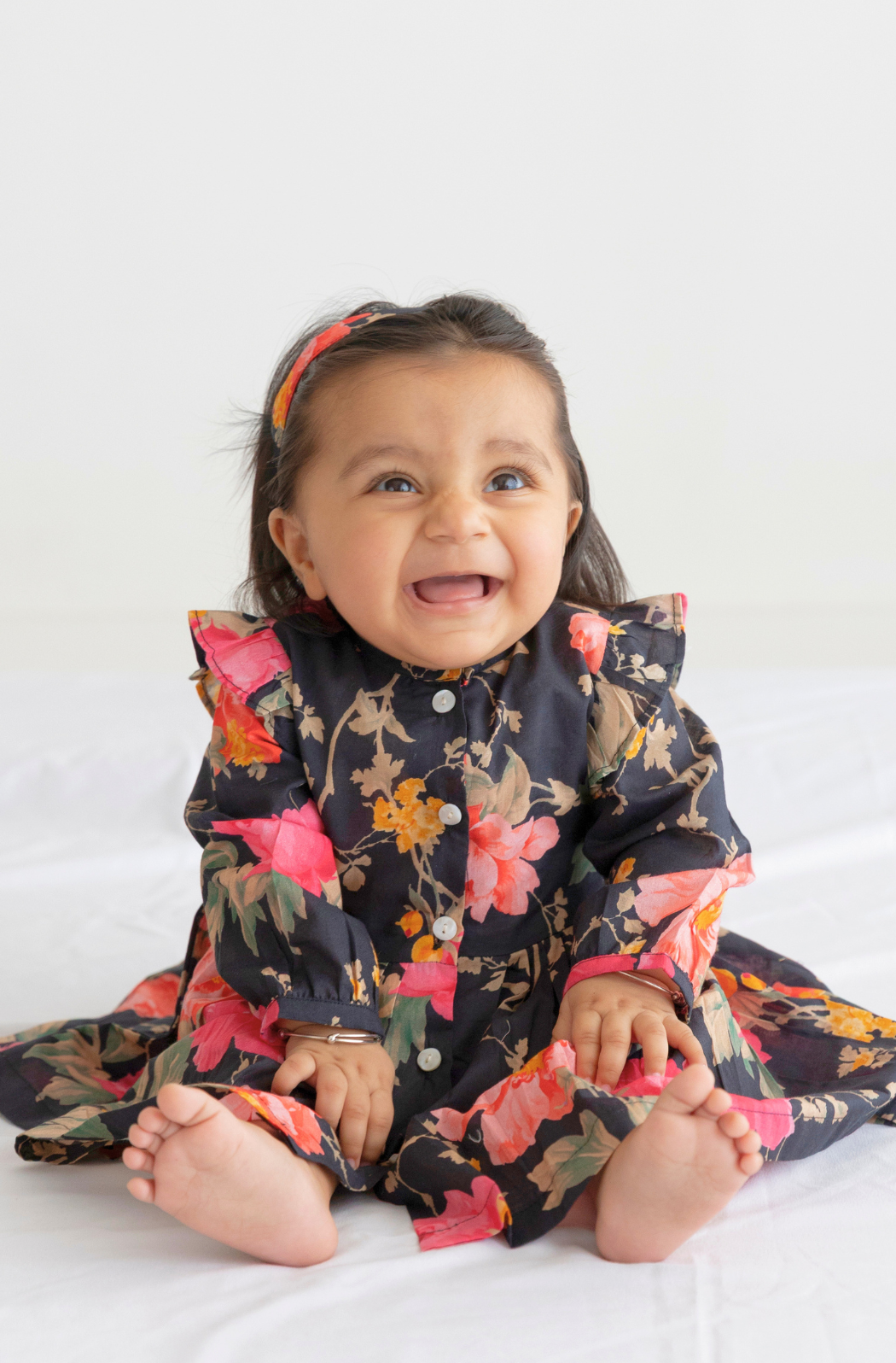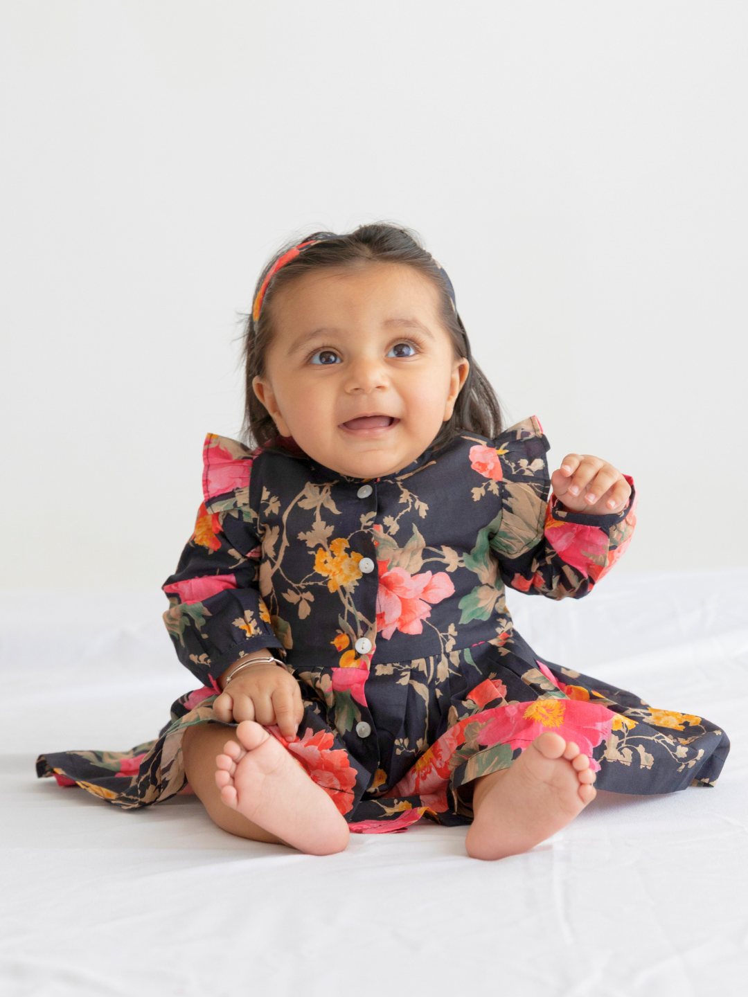 Like a garden in full bloom, this charming dress brings effortless elegance to your little one’s wardrobe. Crafted on a rich black base with vibrant floral prints, it features a beautifully flared silhouette, front button detailing, and comfortable full sleeves. Perfect for twirls, playtime, and special moments, it blends style with all-day comfort.