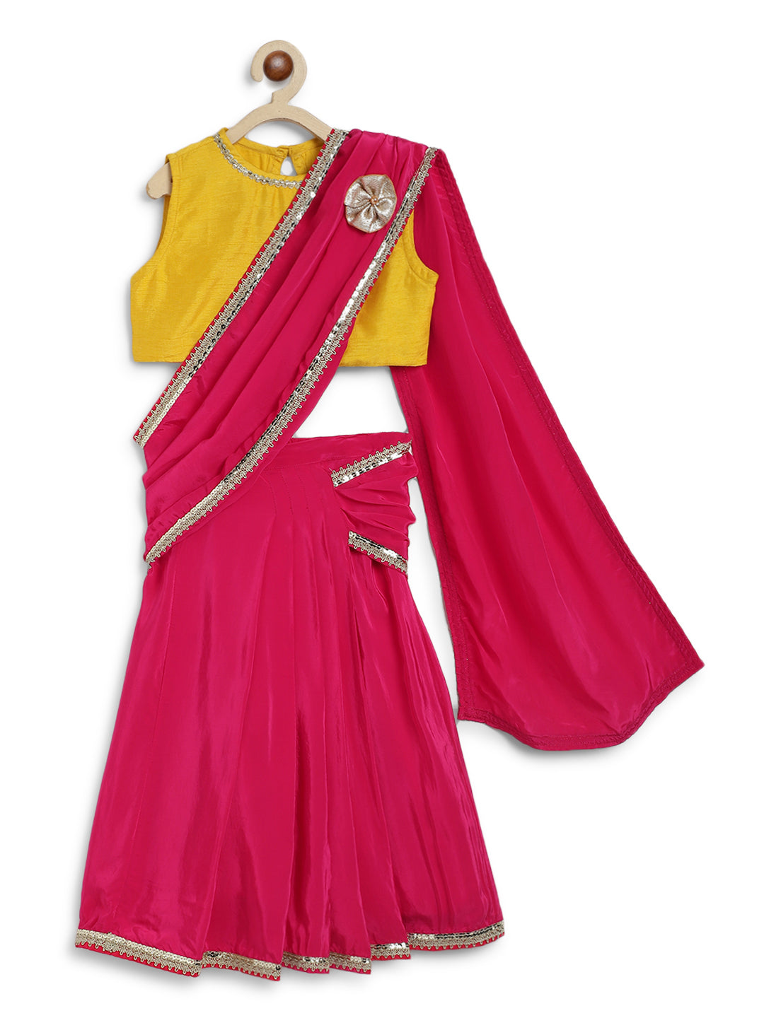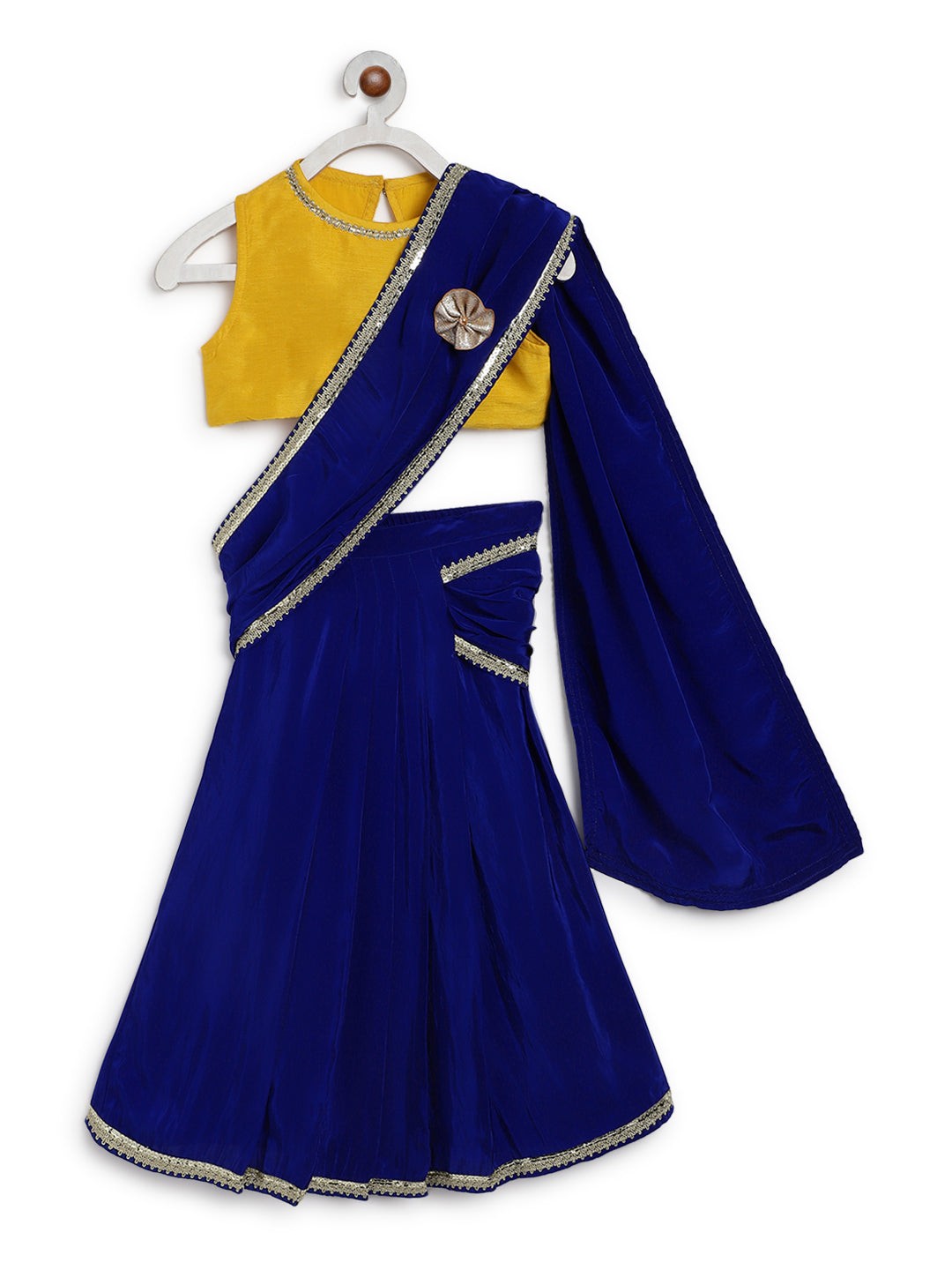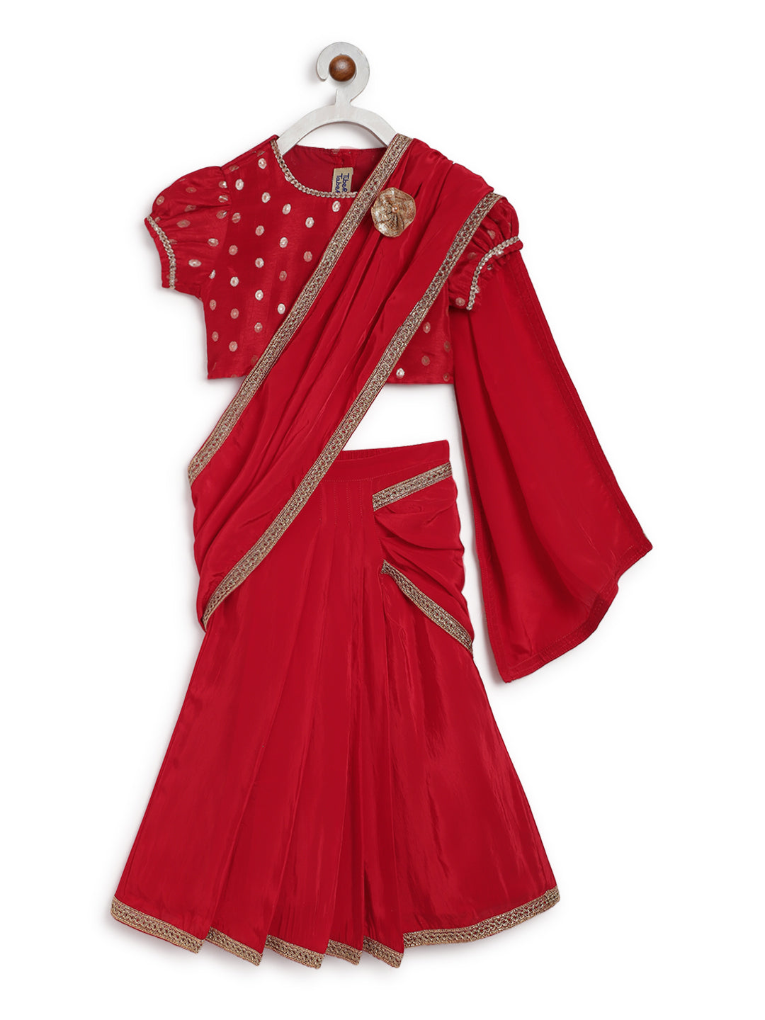 Details: Comes with 1 pre-stitched sari skirt, 1 Blouse and 1 Brooch pin. Finished with lace details