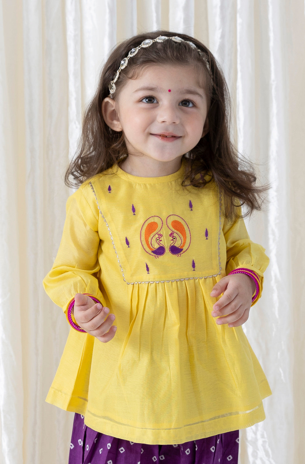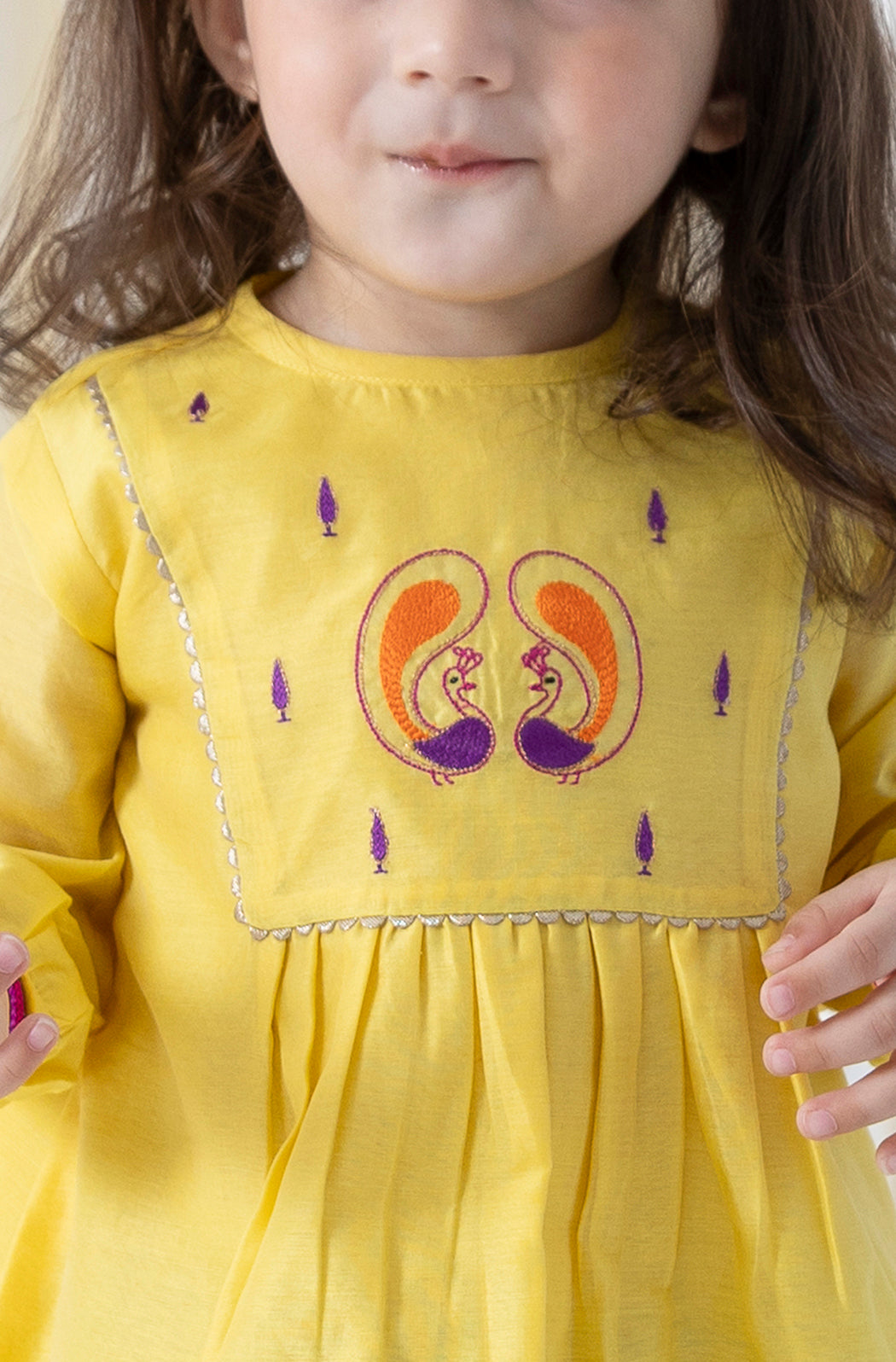 Experience the artistry of Tiber Taber with this stunning chanderi silk suit set for baby girls. Adorned with exquisite peacock embroidery and crafted in rich and bright colours, this piece will make her the star of every festive celebration.