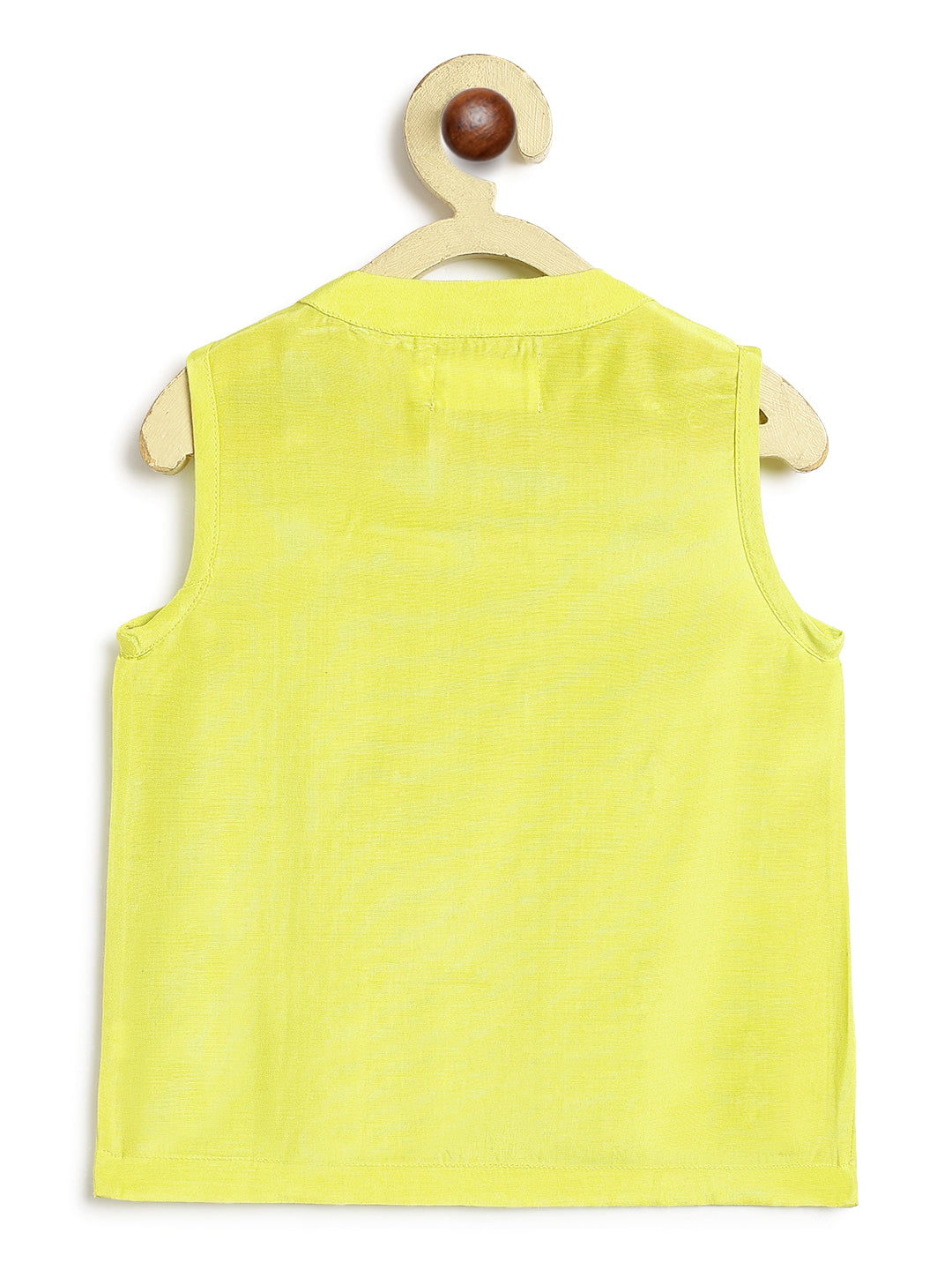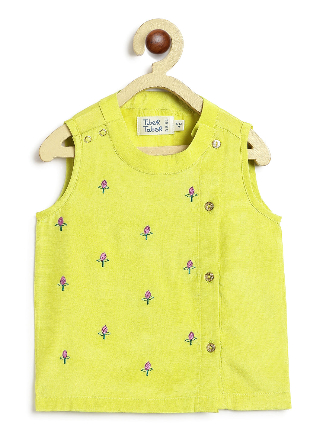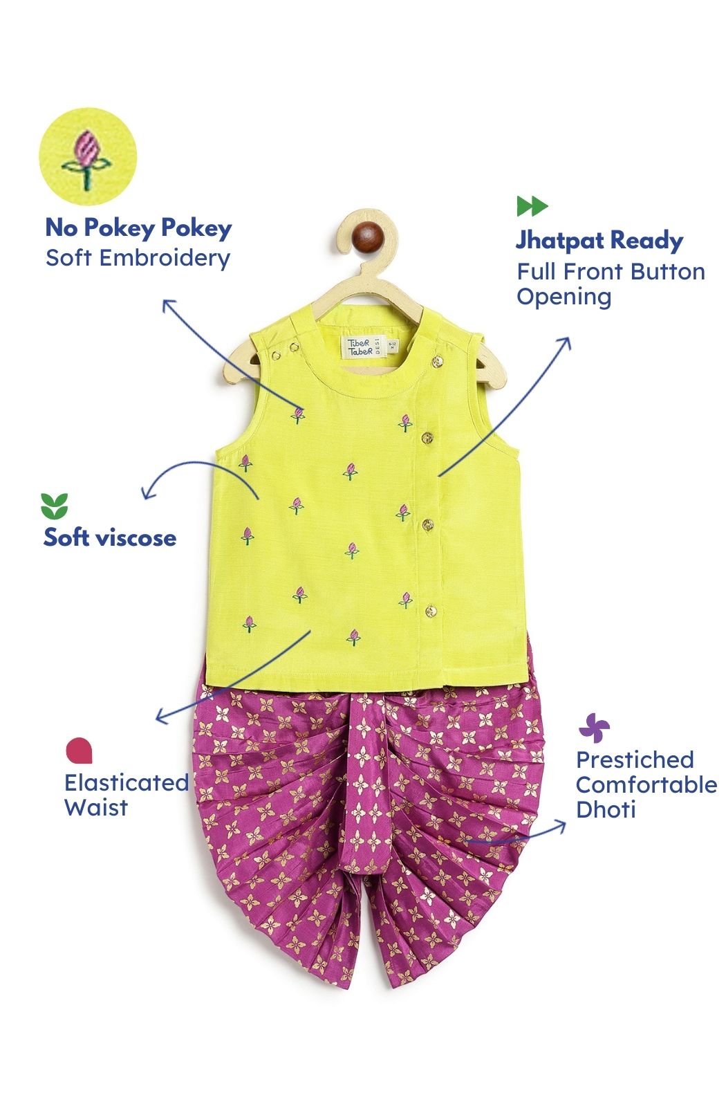 Celebrate your baby boy’s first festivities with this charming dhoti kurta set in bright, happy colours. The soft green kurta features small rose motif embroidery and a full front opening for easy wearing. Paired with a rich purple dhoti with golden foil print, this outfit blends tradition with comfort. Made from 100% viscose, it’s lightweight, breathable, and perfect for occasions like Janmashtami, Ganesh Chaturthi, naming ceremonies, or festive family gatherings.