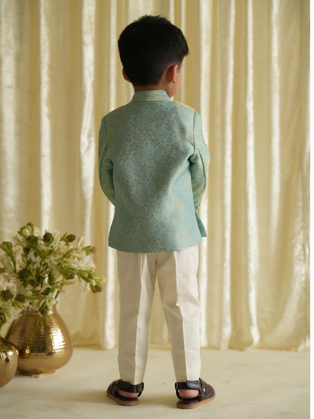 A pastel brocade bandhgala tailored to perfection, complete with shoulder pads and metal buttons for that mini-maharaja look. Expertly crafted to stay comfy even for newborns, it’s your young gentleman’s picture-perfect wedding moment. Dress him up and let tradition shine, the Tiber Taber way!