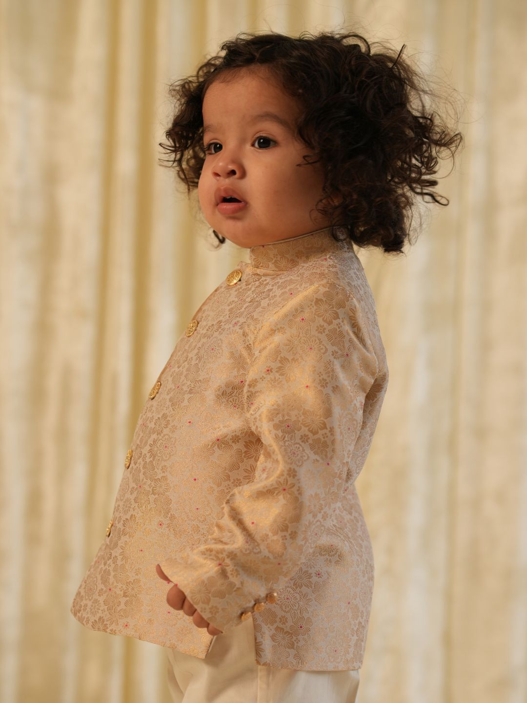 A pastel brocade bandhgala tailored to perfection, complete with shoulder pads and metal buttons for that mini-maharaja look. Expertly crafted to stay comfy even for newborns, it’s your young gentleman’s picture-perfect wedding moment. Dress him up and let tradition shine, the Tiber Taber way!