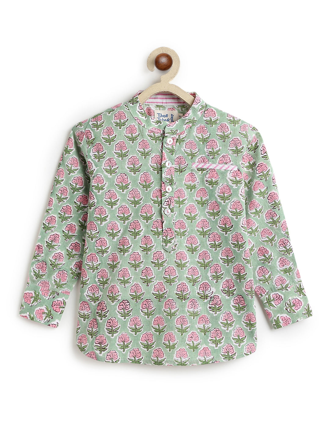 Design Details: Floral block print short kurta with a mandarin collar, button-down front, full sleeves, and a relaxed fit for comfortable, everyday wear
