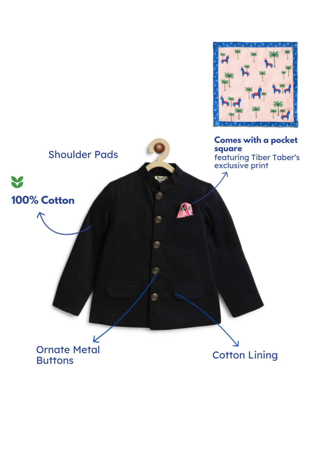 For a look that simply never goes missed, dress him in our classic Bandhgala. This Regal jacket delivers the authentic Nawabi look, impeccably tailored with modern finishes. The exquisite craftsmanship ensures he looks THE Best. Comes with a signature print pocket square.