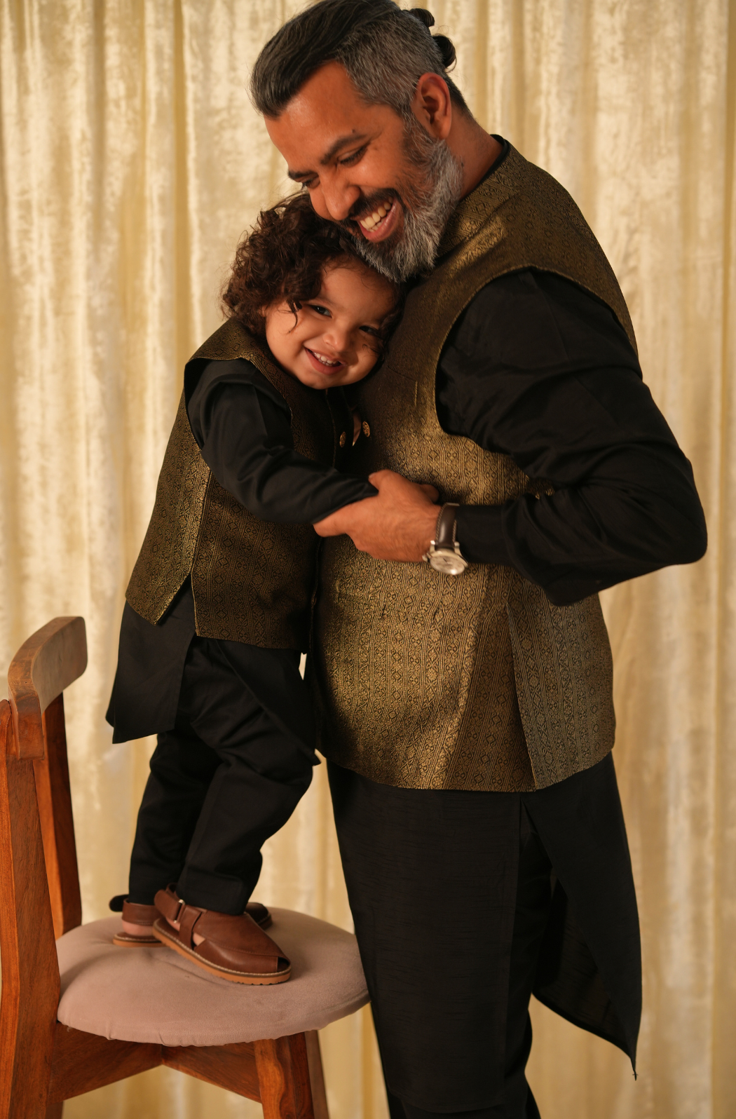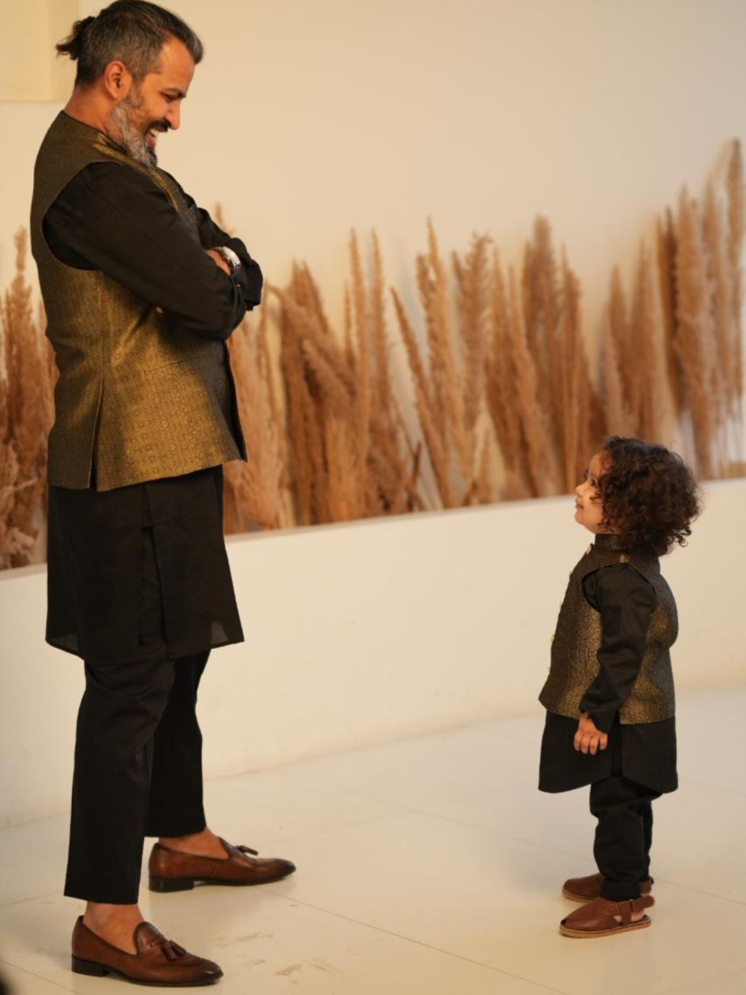Twinning with your little one like a dream come true. A well tailored bundi jacket crafted in exquisite brocade, finished with ornate metal buttons for that regal-yet-modern charm. Sleek piping on collar and along the placket add structured details. Style it with matching kurta and trousers. Welcome to the world of Tiber Taber’s comfort and style