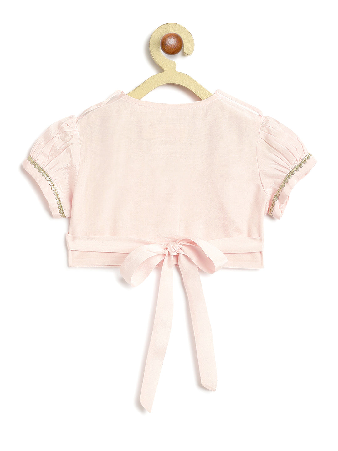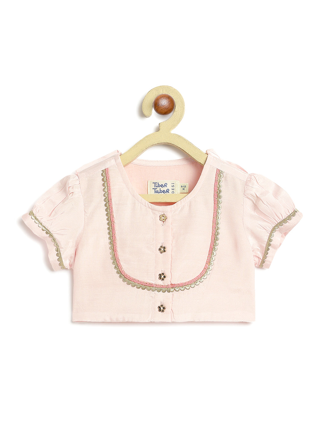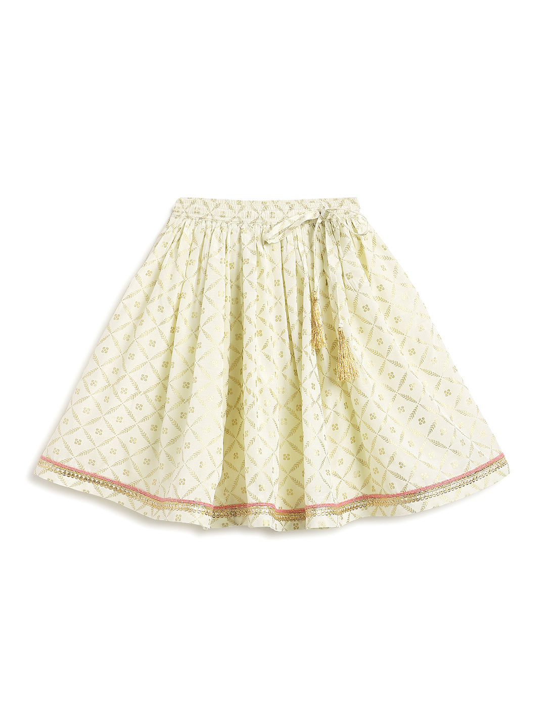 A little tradition, a little twirl! This festive lehenga set is made to make your baby girl shine on special occasions and festivals! Featuring a pastel pink blouse paired with a cream lehenga, the set comes with golden foil print that adds a touch of celebration. Crafted entirely in soft viscose for a lightweight feel, it comes with a matching chiffon dupatta.